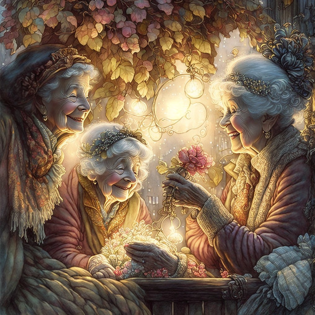 Three elderly women share a joyful moment in a cozy setting, surrounded by warm lights and foliage. They smile as one offers a bowl, radiating warmth and friendship.