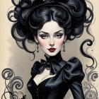 A serene woman with long, flowing black and silver hair adorned with a crown of dark flowers. Her elegant features are framed by intricate gold patterns, exuding a mystical, enchanting aura.