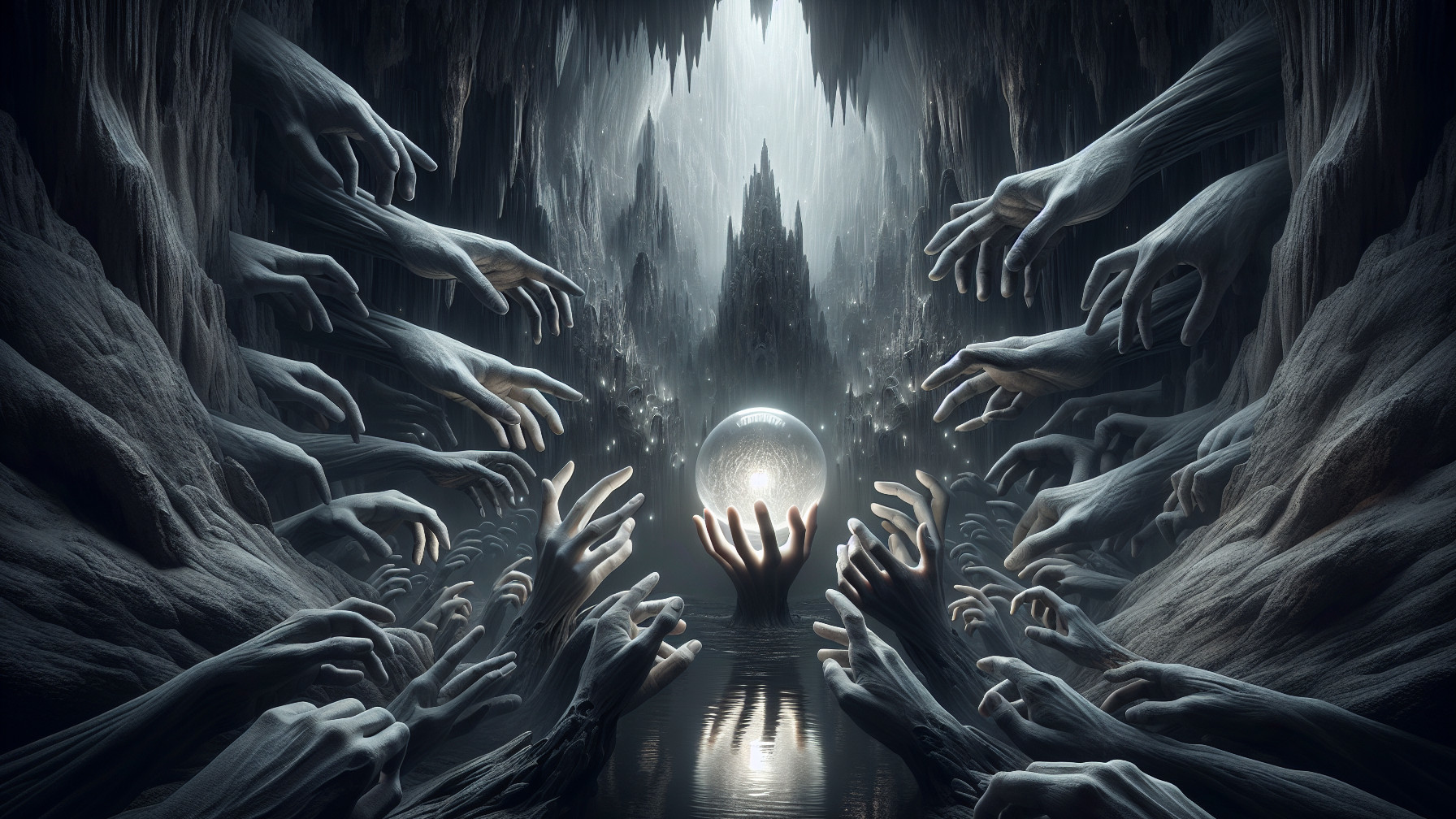 Based on an extraordinary design by another dreamer, whose incredible piece inspired me to create this piece. Huge credit and gratitude to them. In a dark, eerie cave, gnarled hands emerge from a still, reflective pool, grasping a glowing orb. Shadows and ghostly figures loom above, creating a haunting, mystical atmosphere.
