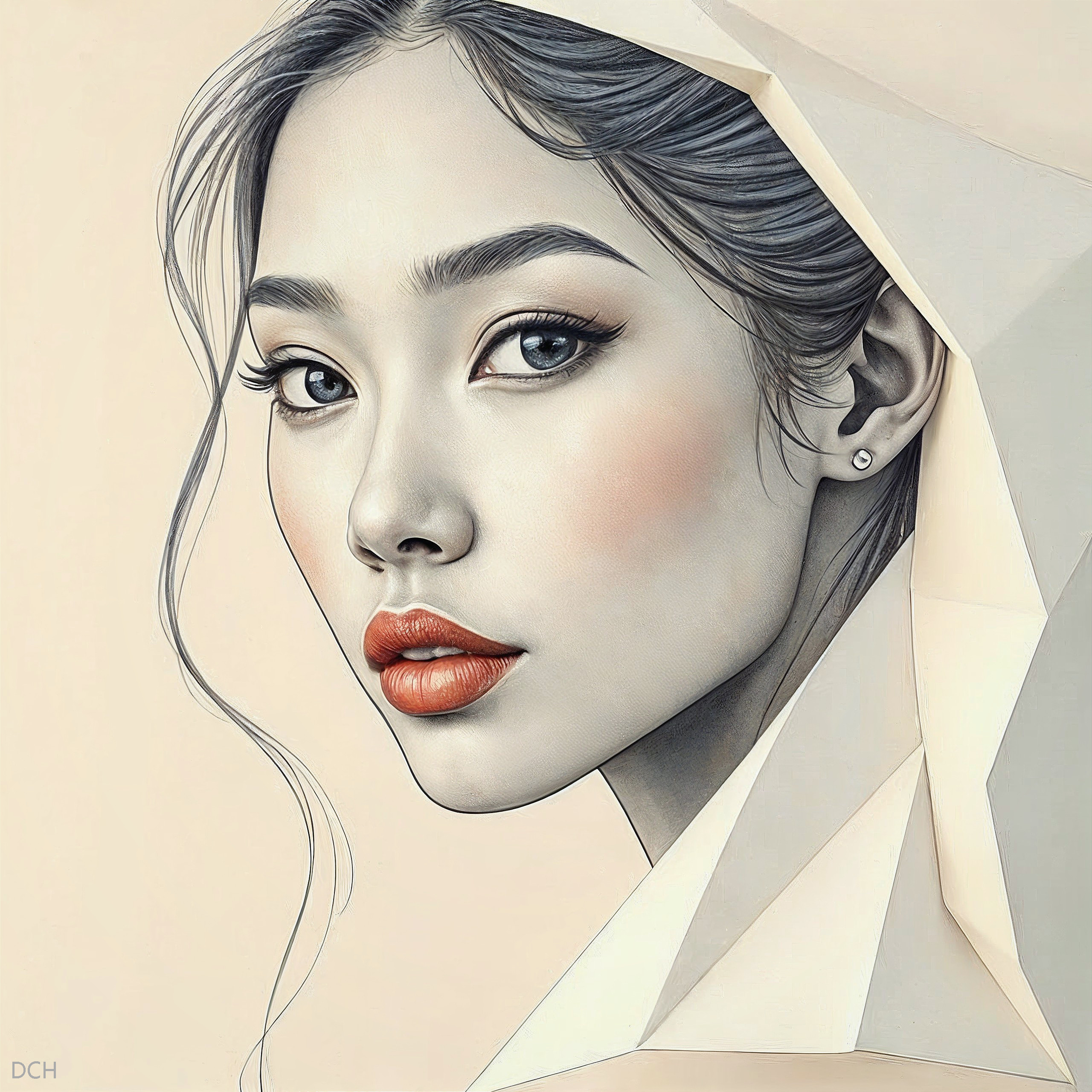 This artwork features a beautifully detailed portrait of a woman with striking features adorned in an origami hood, highlighting her expressive eyes and full lips, complemented by a plain beige background.
