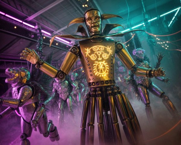 A vibrant, psychedelic illustration featuring a figure at a chessboard, with surreal and colorful cosmic and fantastical elements surrounding them.