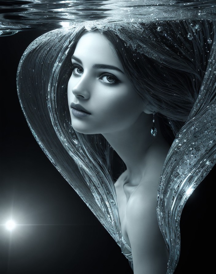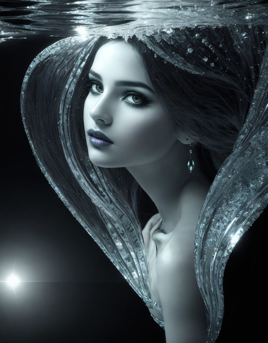 A striking portrait of a woman with dark hair and vibrant lips, her image reflected on a water surface.