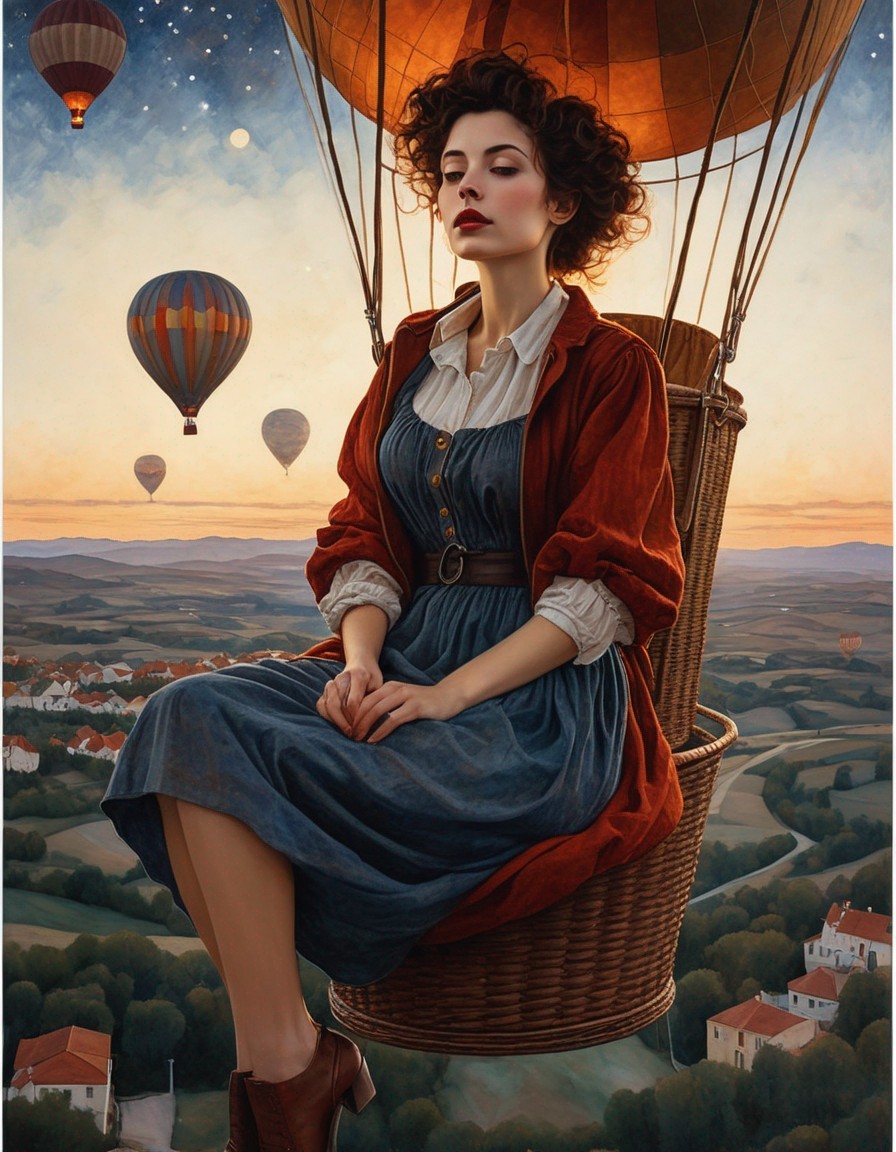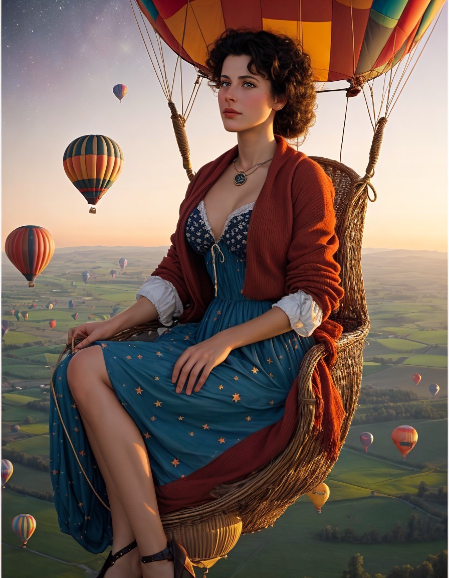 A woman in a blue dress reads a book in a hot air balloon basket, floating above a rugged landscape at sunset with other balloons in the sky.