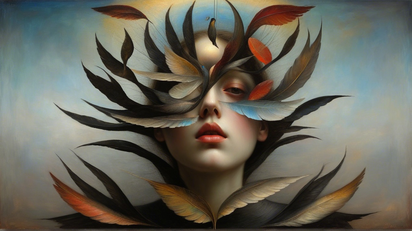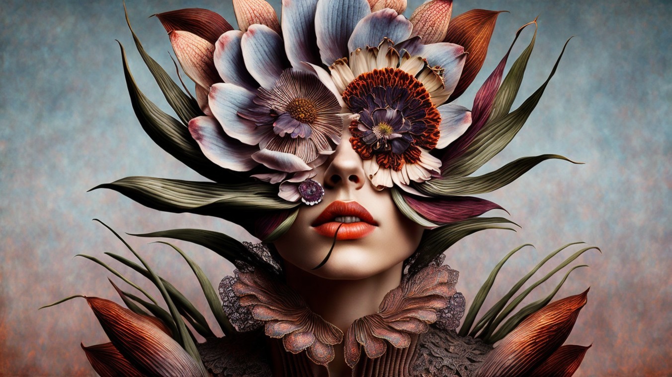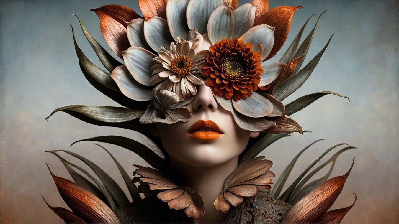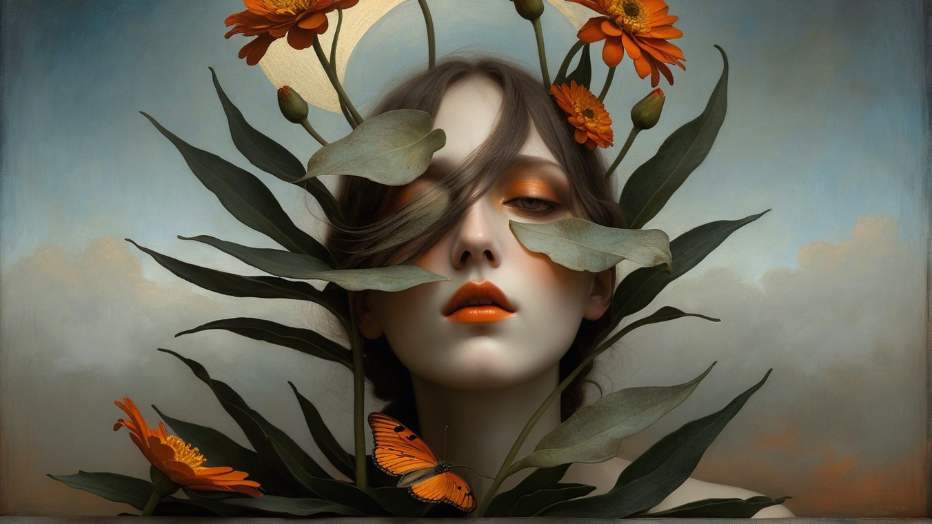 A serene young woman in an orange dress is surrounded by vibrant orange flowers. She sits gracefully, holding a flower, against a soft, dreamy background with a glowing moon.