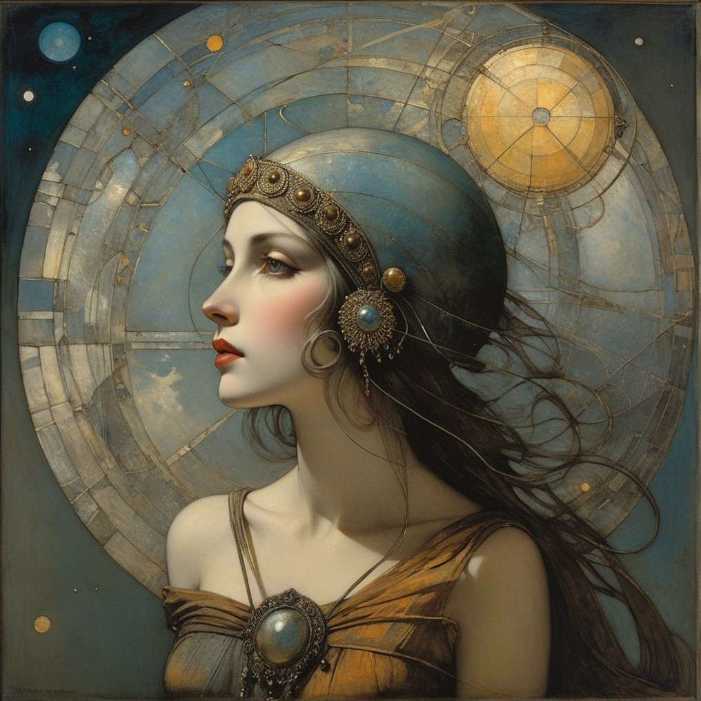 A stunning portrait of a woman adorned in a golden dress and a decorative helmet, set against a serene background with a circular motif and a luminous moon, embodying elegance and mystery.