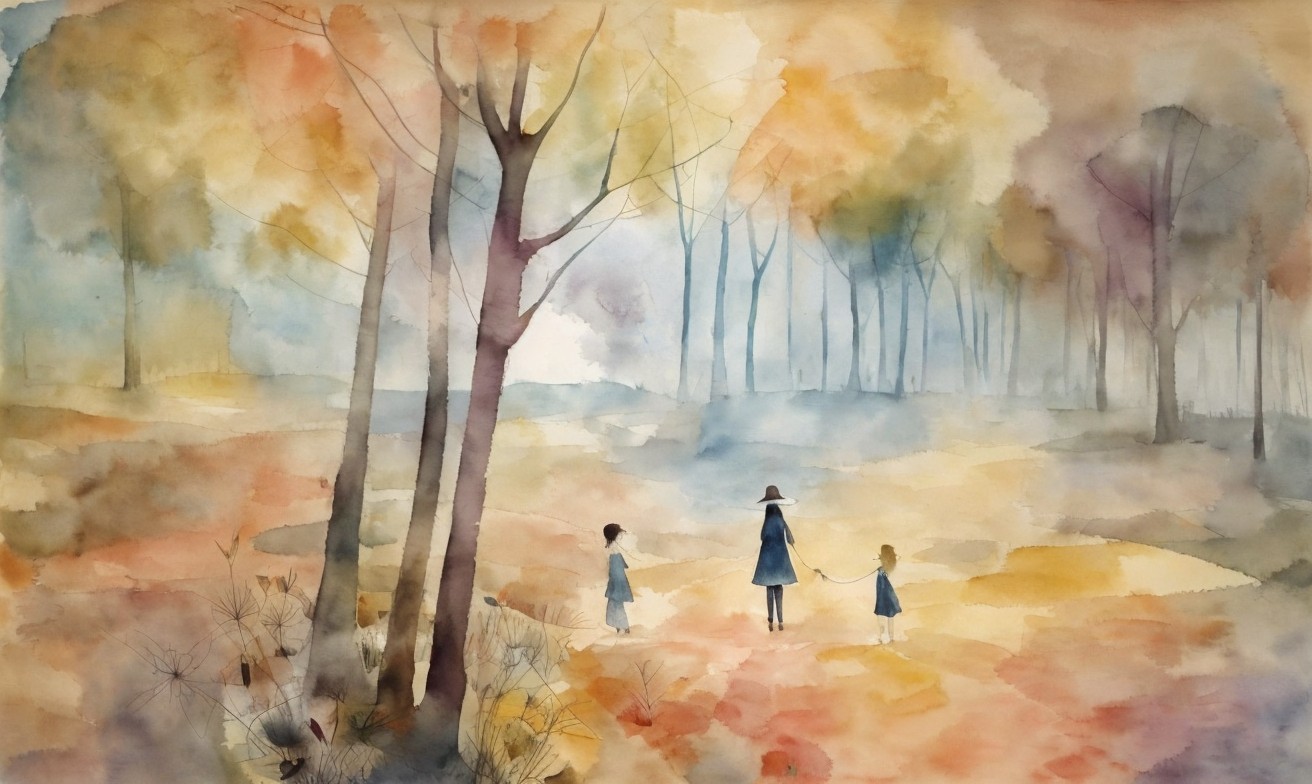 A watercolor painting of three figures in a serene, autumnal forest with warm hues and blurred tree outlines.