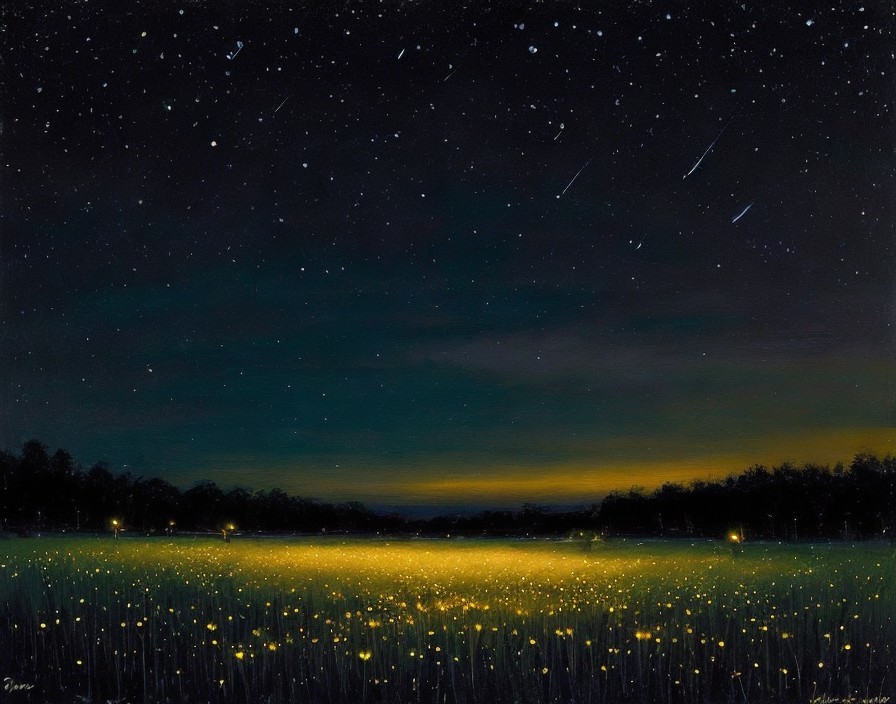 A starry night sky with shooting stars above a dark landscape illuminated by numerous fireflies.