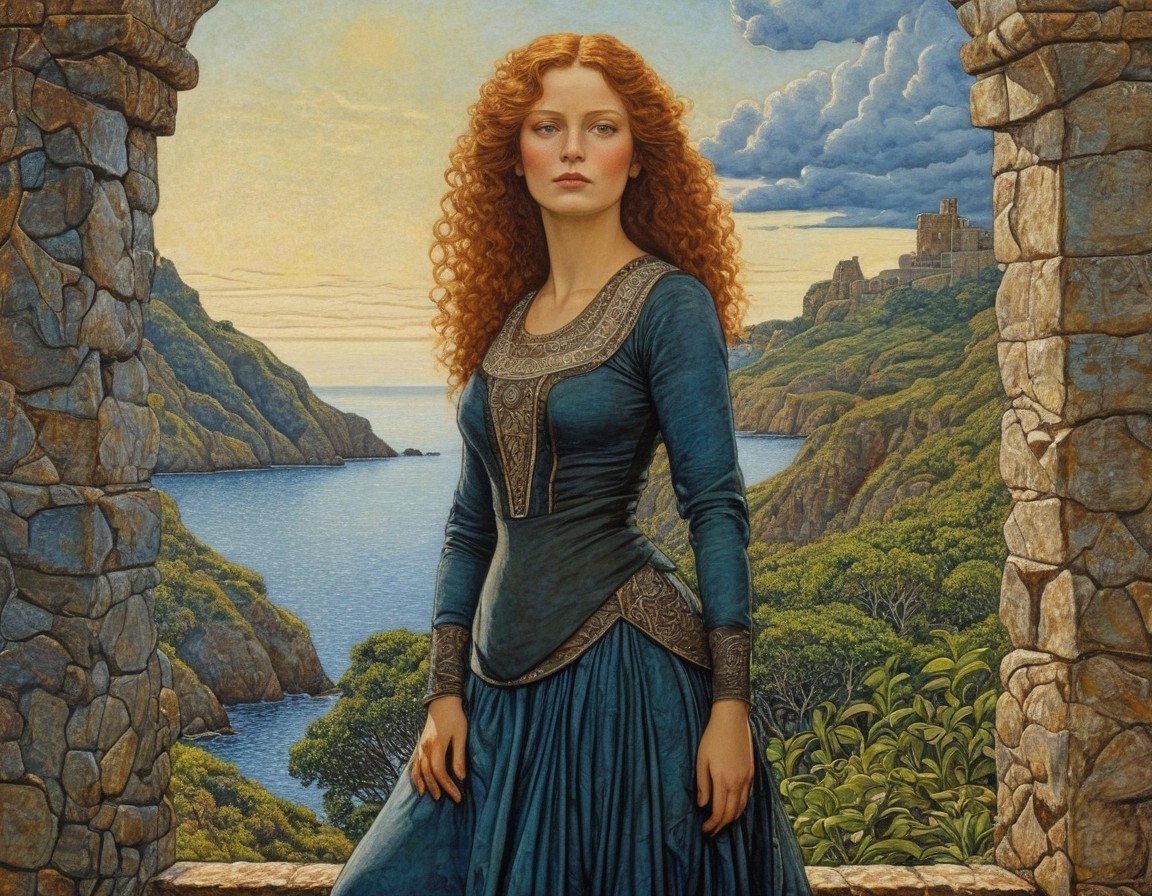 A digital painting of a red-haired woman in a blue dress, standing before a coastal background with a lighthouse under a clear sky.