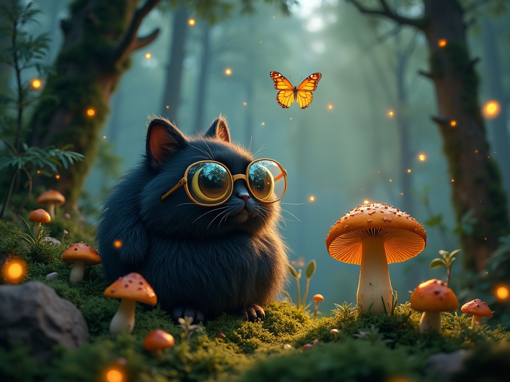 A fluffy black creature with oversized glasses sits among vibrant mushrooms in a mystical forest. A colorful butterfly flutters nearby, illuminated by soft, glowing lights in the enchanting scene.