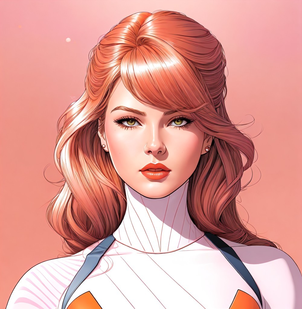+ Prompt:Marvel comic book art, lineage art, 1990s animated female fantasy character, beautiful headshot, space age style, upper body portrait, minimalistic curves, , stylized line-art illustration, style of pulp art merged with lineage illustration,colored light pink, softened orange, exquisite clothing detail, action pose gestures, striped, stylized drawing , Layered geometrical Artwork, squiggly lines, dynamic lighting by buckminster fuller, pastel colors, 8k, RAW photo, highest quality, somber, a mysterious lady with eerie eyes, shrouded with enigmatic aura, depth of field, animated marvel heroine in style of Georgia O'Keefe and Overton Loyd and Barclay shaw and Geof darrow, blonde long hairstyle with hairbangs, eroticism, perfect handsface, eerie, muted tones, symmetrical, somber, pastel colors, overall composition by Georgia O'Keefe and Andrew Atroshenko and Barbara canepa and Susan Seddon Boulet,