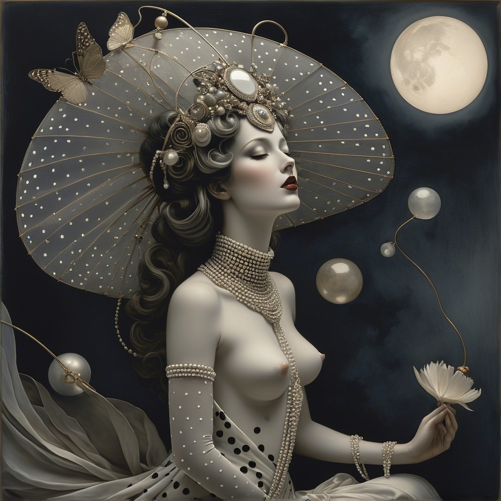 + Prompt:A woman adorned in spots. Surreal dream in the style of Michael parkes. Whimsy of catrin wells stein , nostalgia, glory, Mercury Glass patina, light and gossamer haze, moody, Art Brut, moody, somber, desaturated colors. In the style of John Rogers cox . This artwork amalgamates the artistic styles of Michael Parkes,