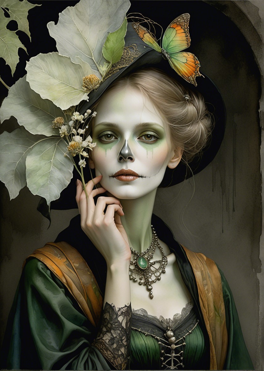 A striking figure with a skeletal face and green skin wears a witch's hat adorned with leaves and a butterfly. Her outfit blends elegance and the macabre, embodying a haunting beauty.