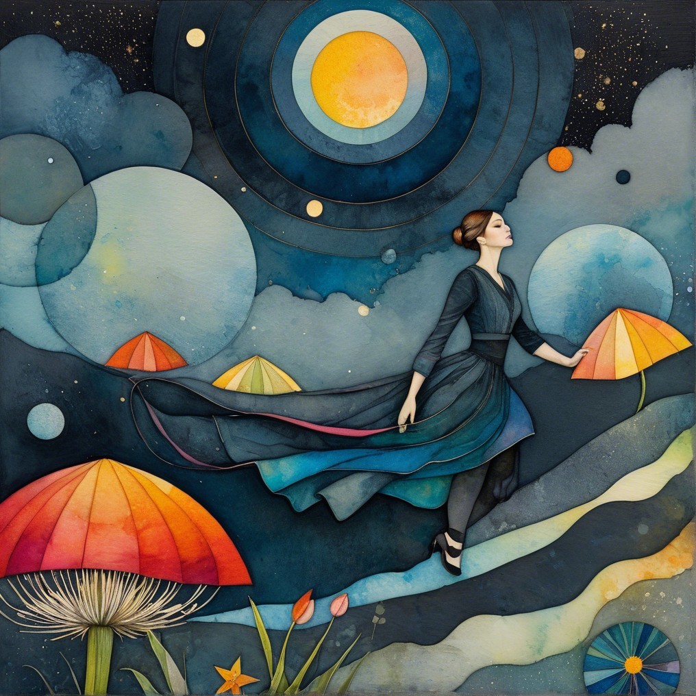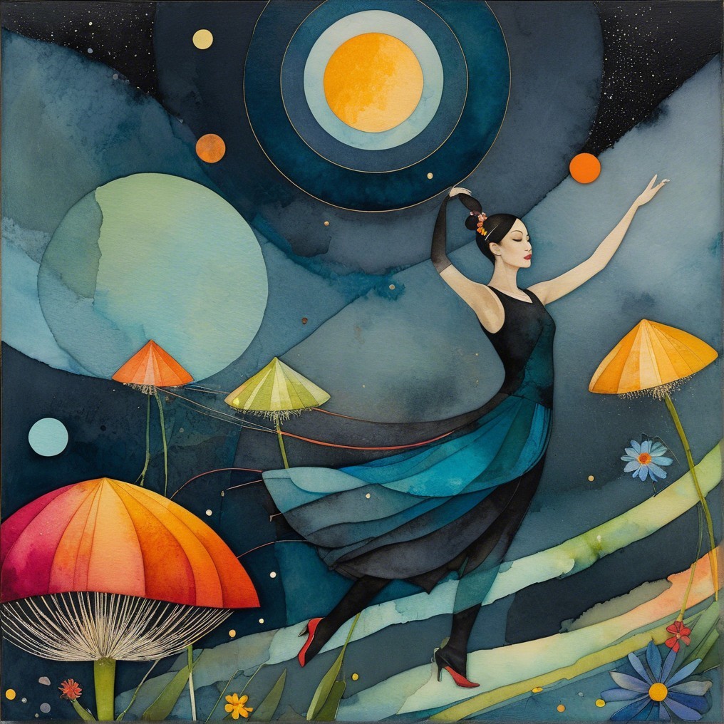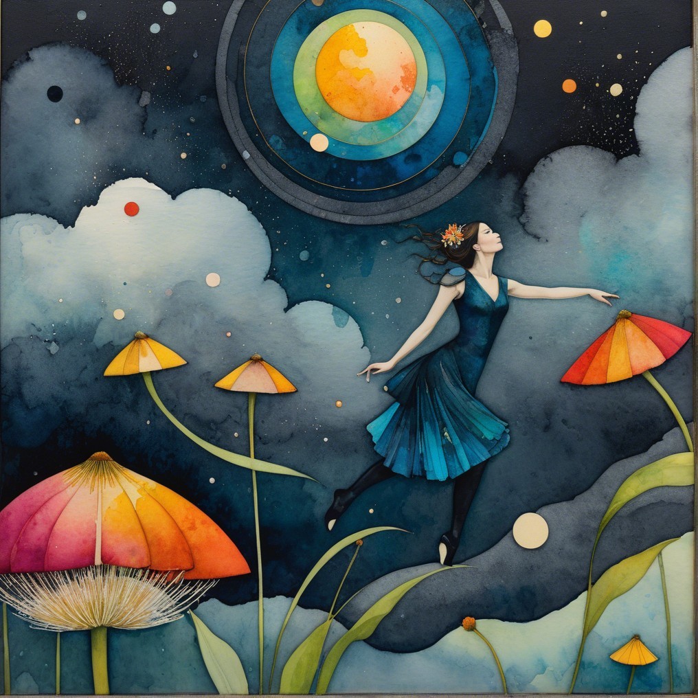 A surreal scene unfolds as a graceful dancer, adorned in a flowing blue dress, reaches towards cosmic shapes suspended above. Giant colorful mushrooms dot the dreamlike landscape, while layered, concentric celestial bodies evoke a sense of astral wonder. She appears to drift through a serene night sky, surrounded by orbs and fantastical plants.