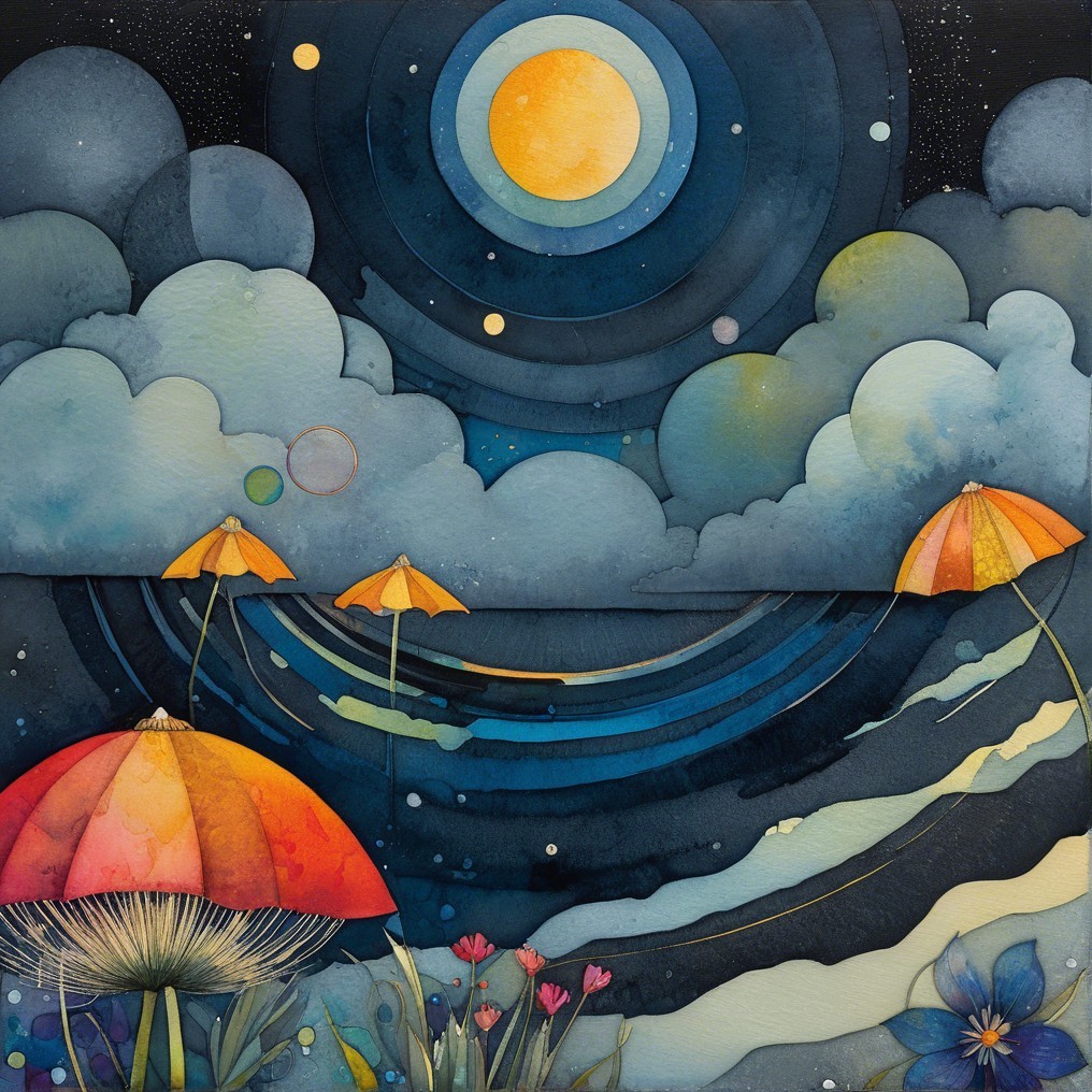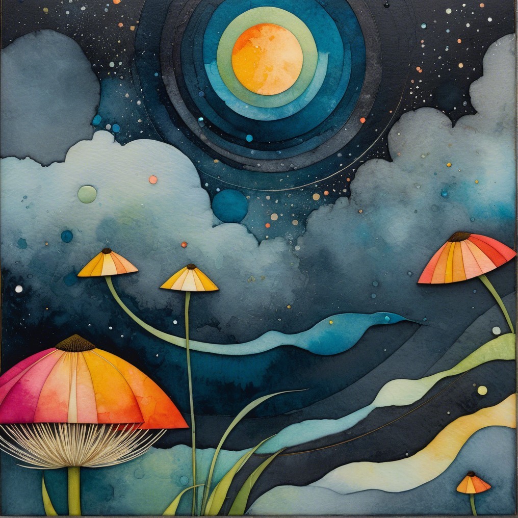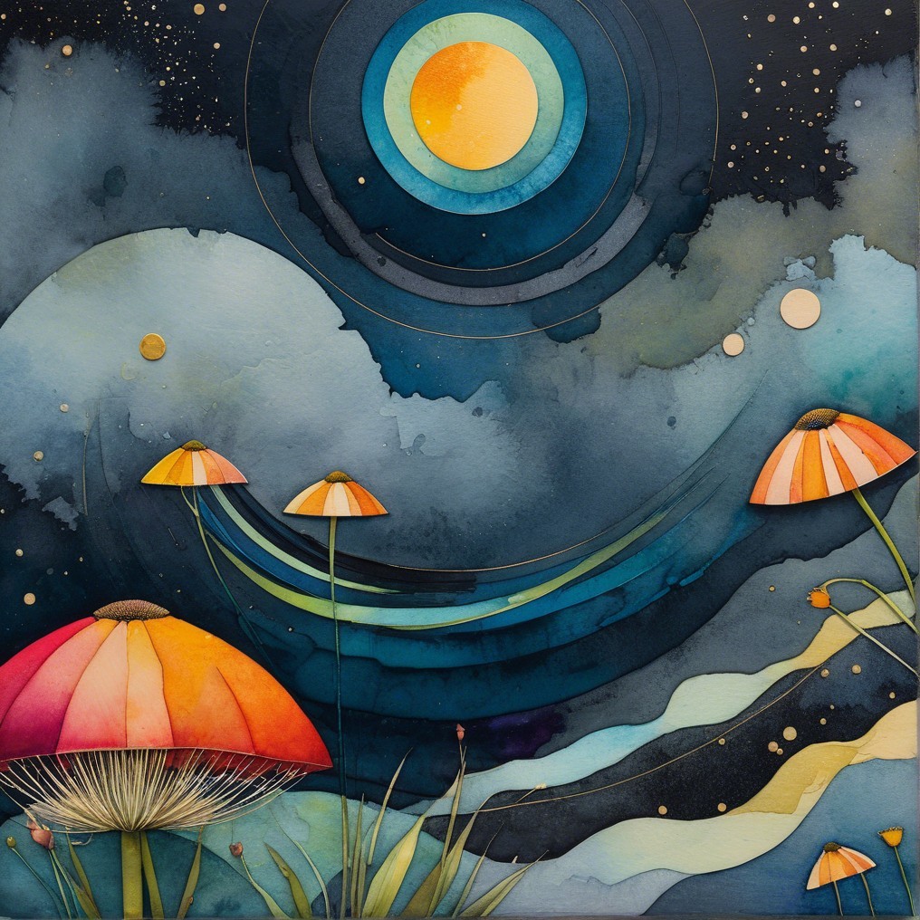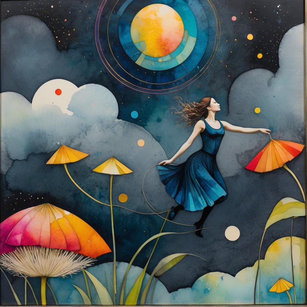 A surreal scene unfolds as a graceful dancer, adorned in a flowing blue dress, reaches towards cosmic shapes suspended above. Giant colorful mushrooms dot the dreamlike landscape, while layered, concentric celestial bodies evoke a sense of astral wonder. She appears to drift through a serene night sky, surrounded by orbs and fantastical plants.