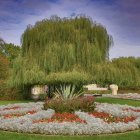 A majestic willow tree stands at the center of a vibrant garden, surrounded by colorful flowerbeds and lush greenery, under a serene sky with soft clouds. The scene evokes tranquility and beauty.