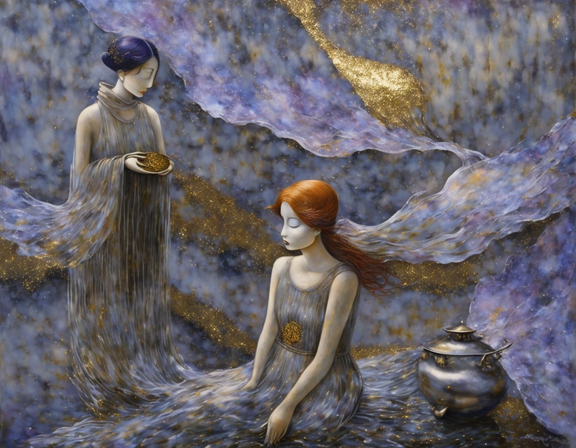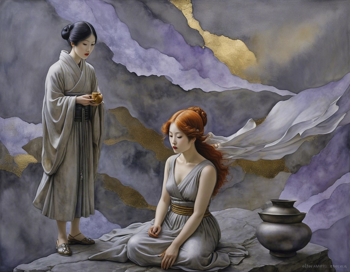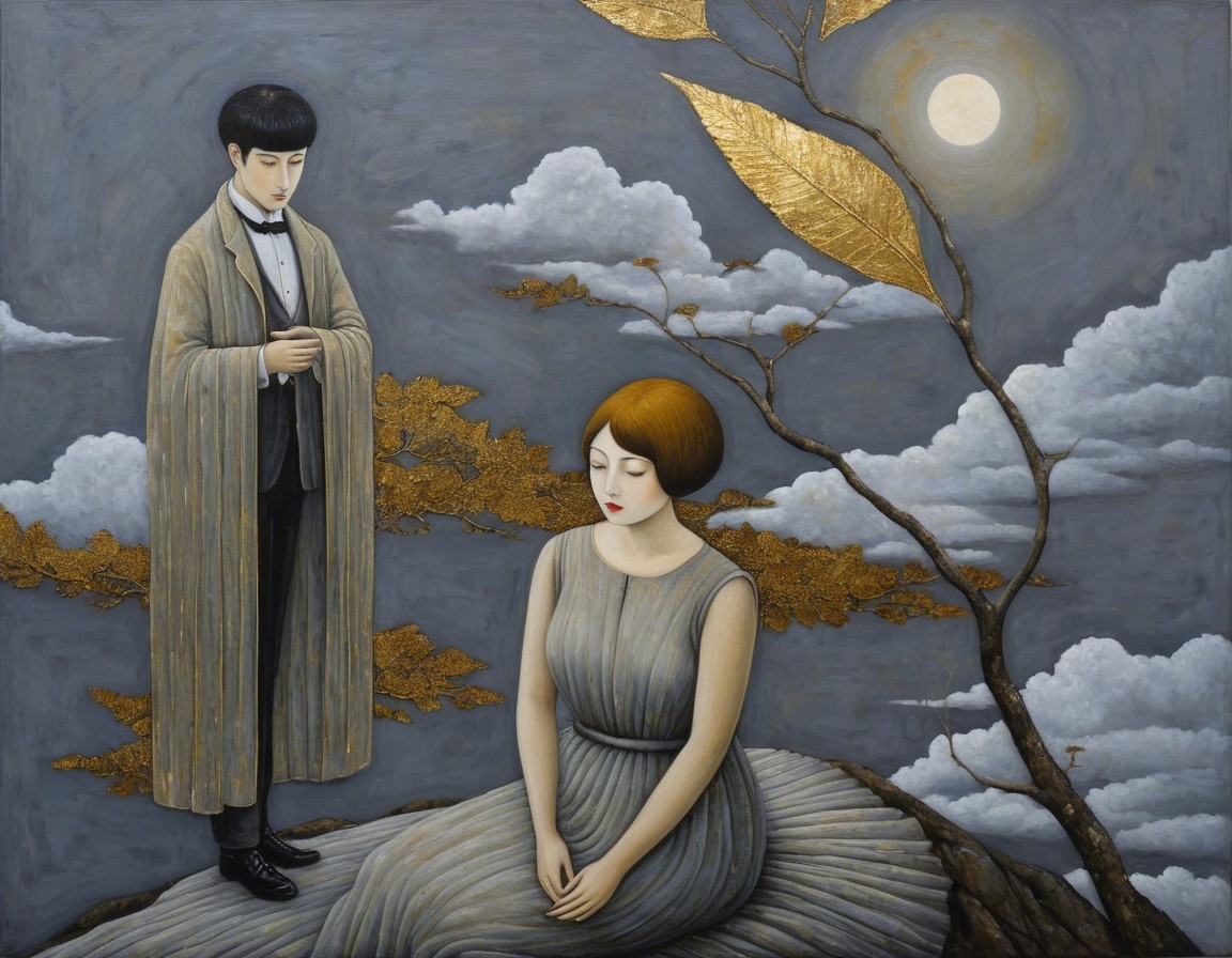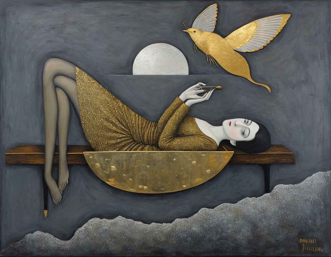 A serene figure in a gold dress reclines on a crescent shape, gazing dreamily at a bird soaring above against a gray backdrop, evoking a sense of tranquility and whimsy.