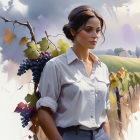 A young woman stands in a vineyard, wearing a light blue shirt. She gazes thoughtfully towards rows of grapevines, with ripe grapes hanging nearby and rolling hills in the background.