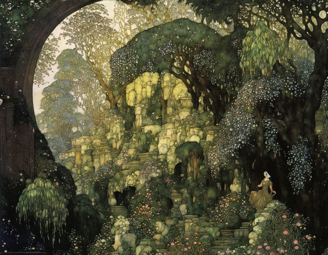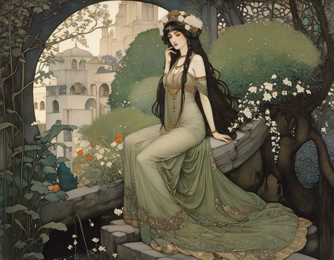 A painting of a woman with long black hair in a flowing gown sitting by a balustrade, surrounded by flowers with a lakeside village backdrop.