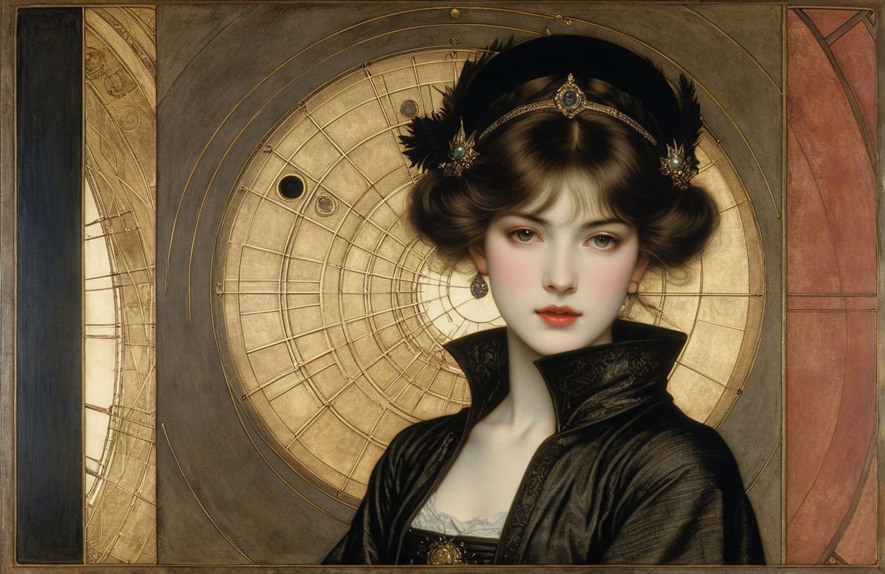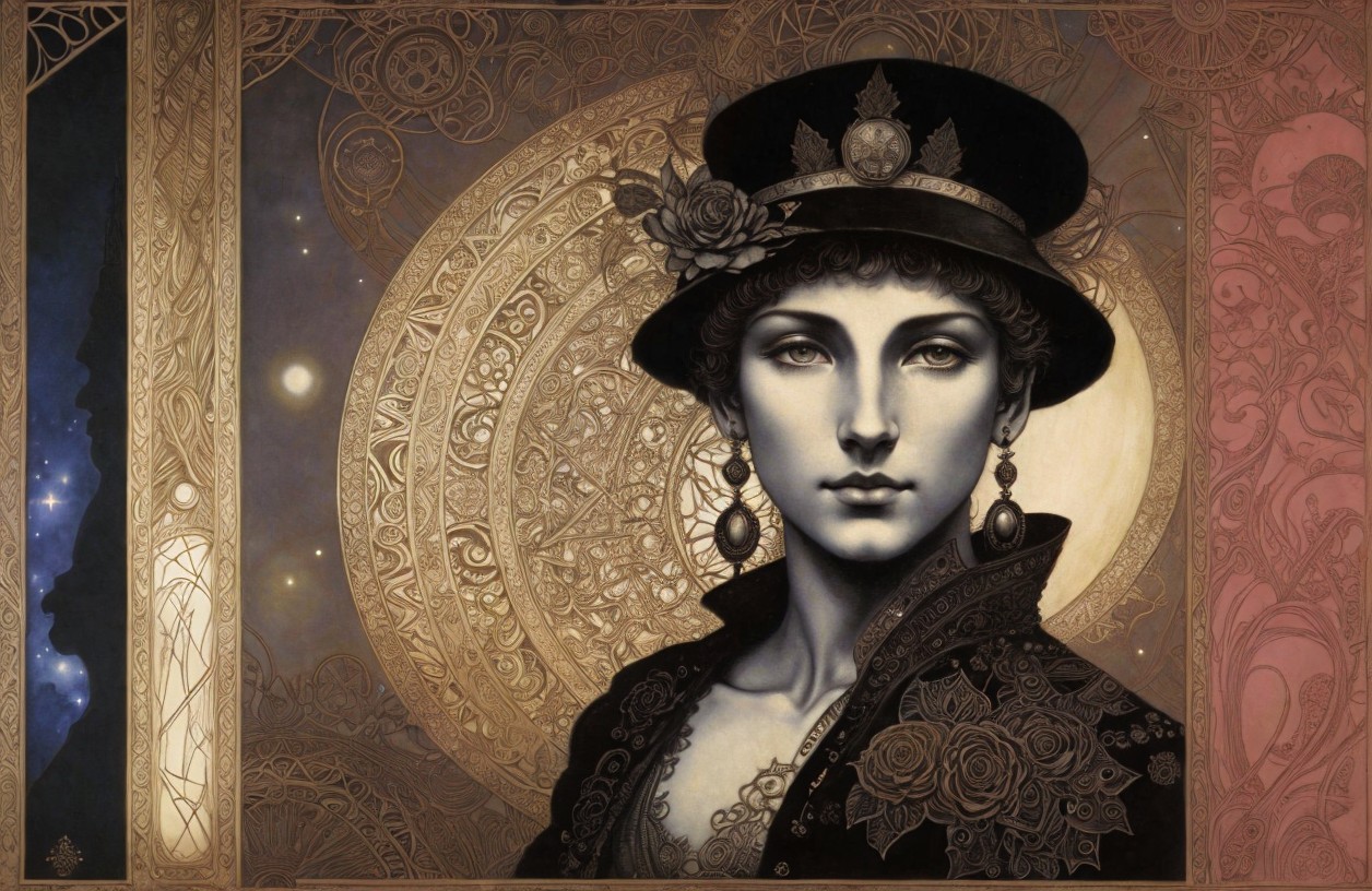 A woman in a glamorous black gown poses against a circular backdrop, featuring ornate details. Her flowing hair and elegant features exude a sense of timeless beauty and grace.