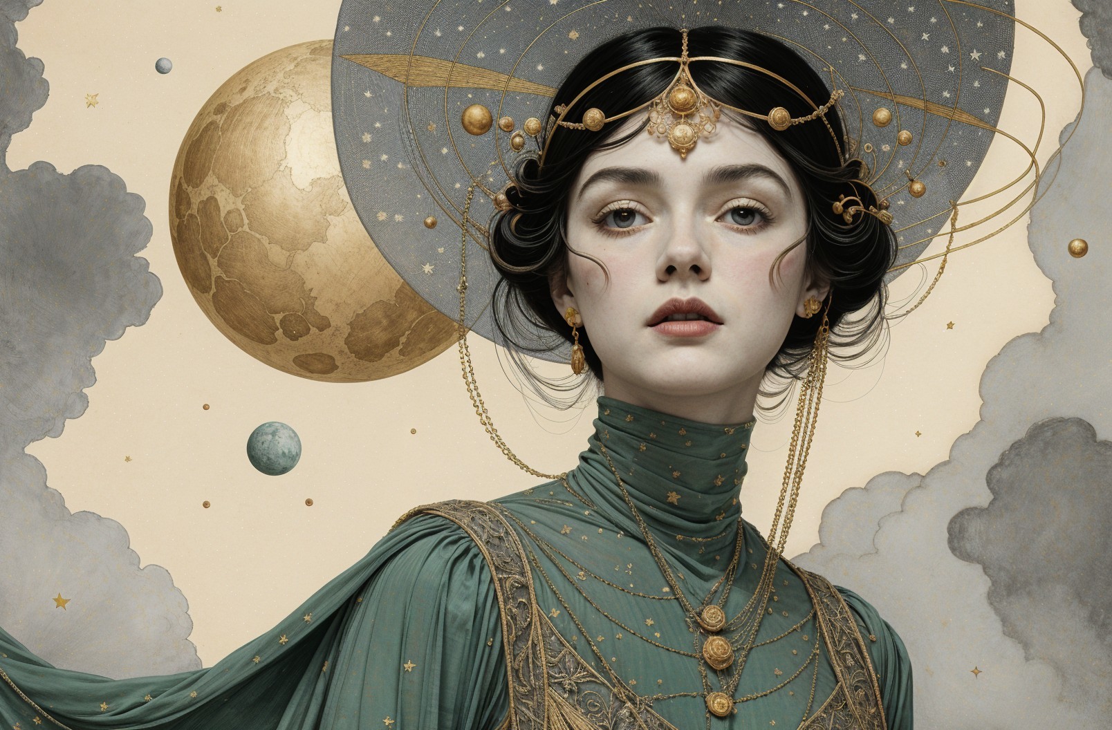 Stars and comets are woven into a beautiful shimmering ladder to the sky leading to the planets, in the style of Aubrey Beardsley, Michael ParkesP