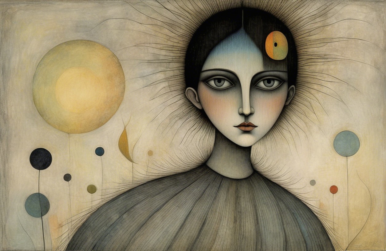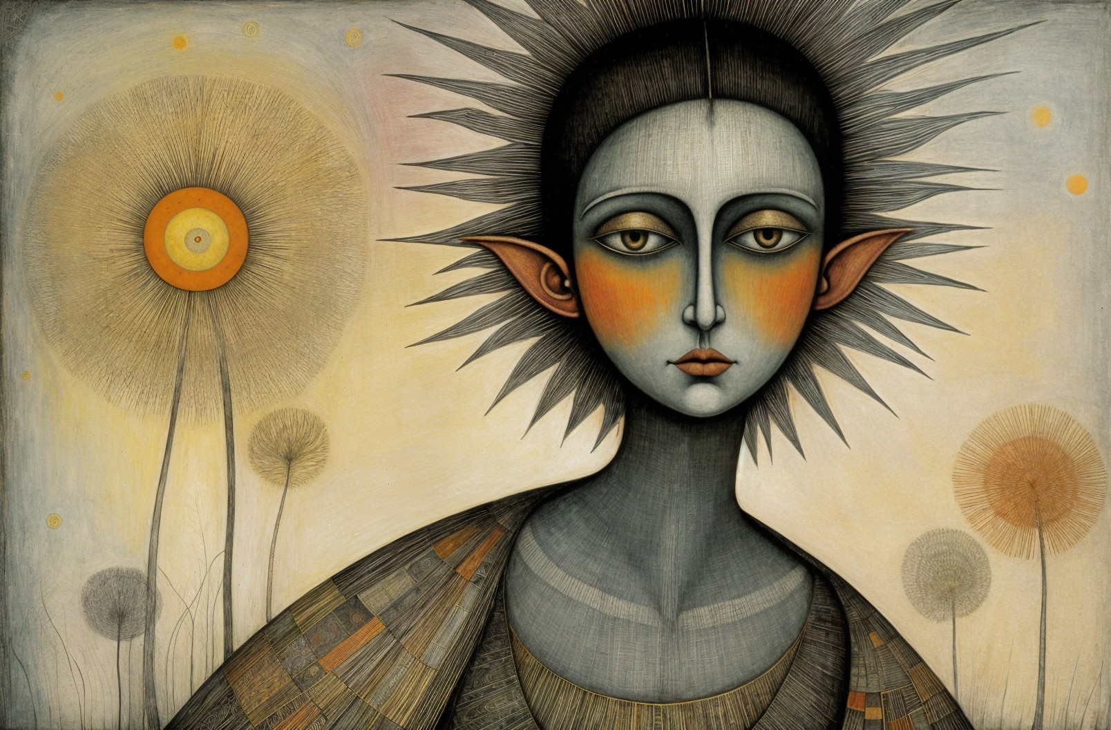 Beautiful psychedelic Creature in the style of Edward Gorey, Maurice Sendak Art Brut, moody, somber, desaturated colors, in the style of Paul Klee, Arthur Rackham. style of Alex Grey, style of Remedios Varo, style of Paul Klee, style of Leonora Carrington, eye contact, soft, beautiful delicate interplay of light and shadows on every surface, exotic, vivid, radiant, kaleidoscopic, highly colorful, most complex and highly intricate, dominant golden and orange colors, highly intricate and utterly complex designs and patterns, exciting.