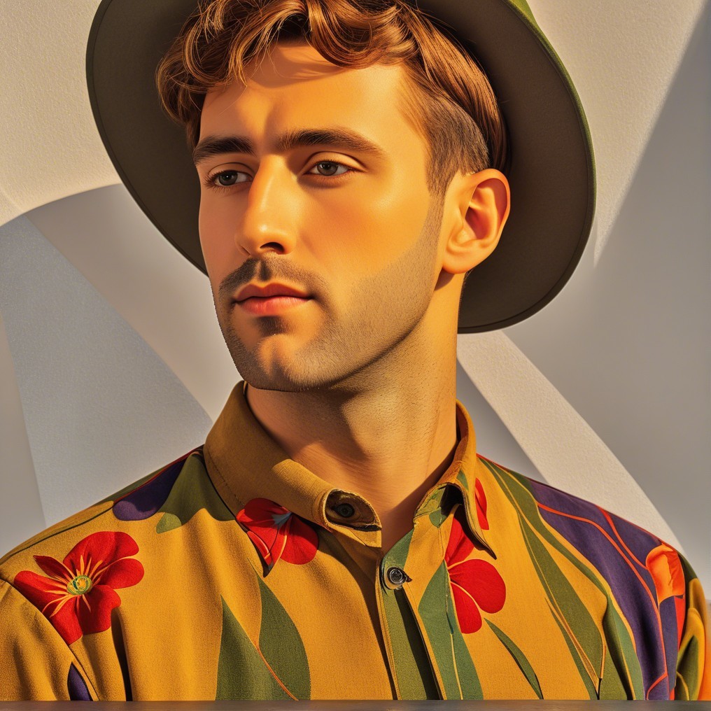 A young man stands against a light background, wearing a vibrant, floral-patterned shirt and a stylish hat. His expression is confident, showcasing a modern, artistic vibe.