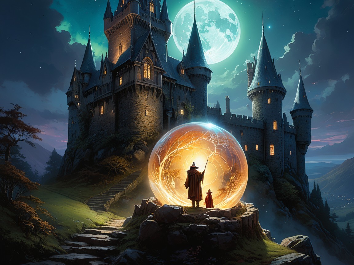 A whimsical scene featuring a majestic castle with tall towers and glowing orbs. A cloaked figure stands before an intricate, illuminated sphere, surrounded by a mystical, starry night.