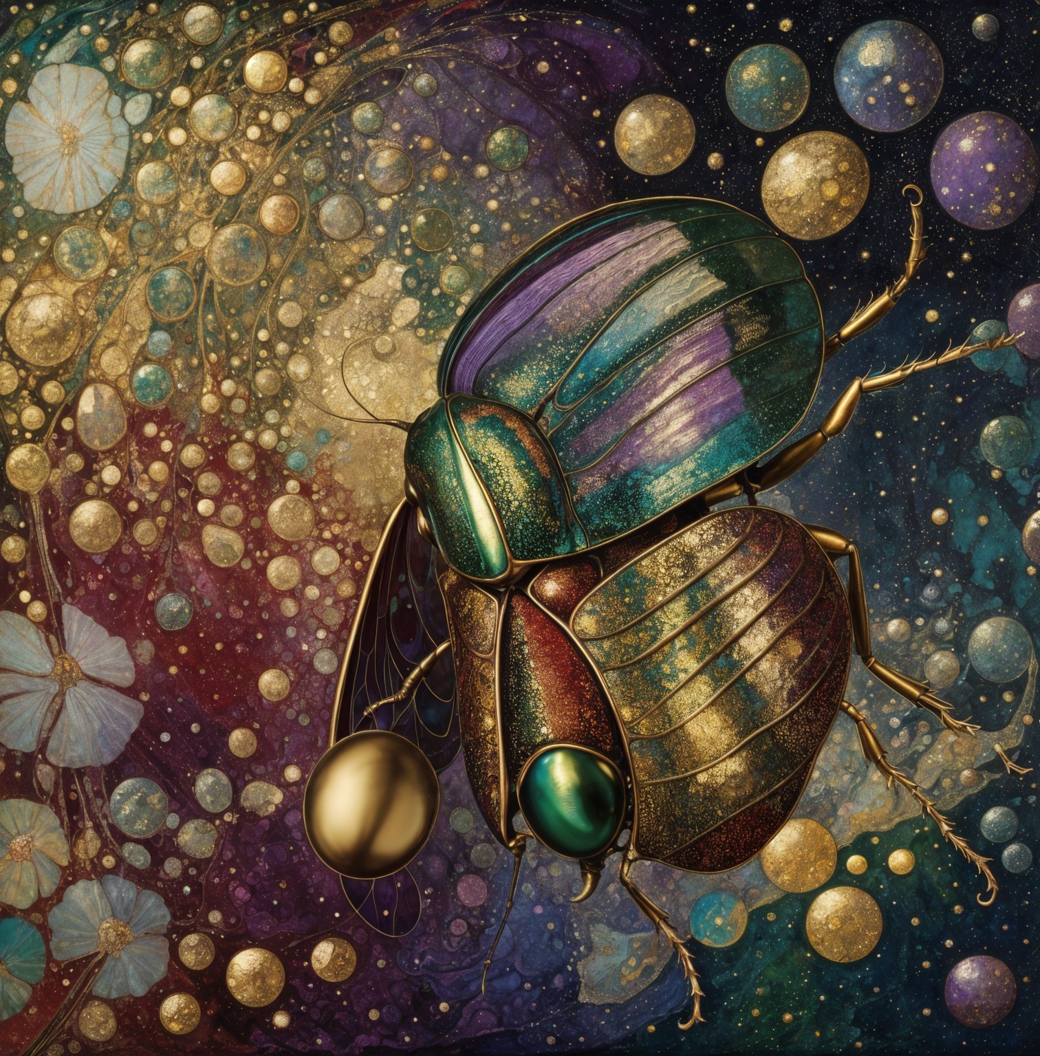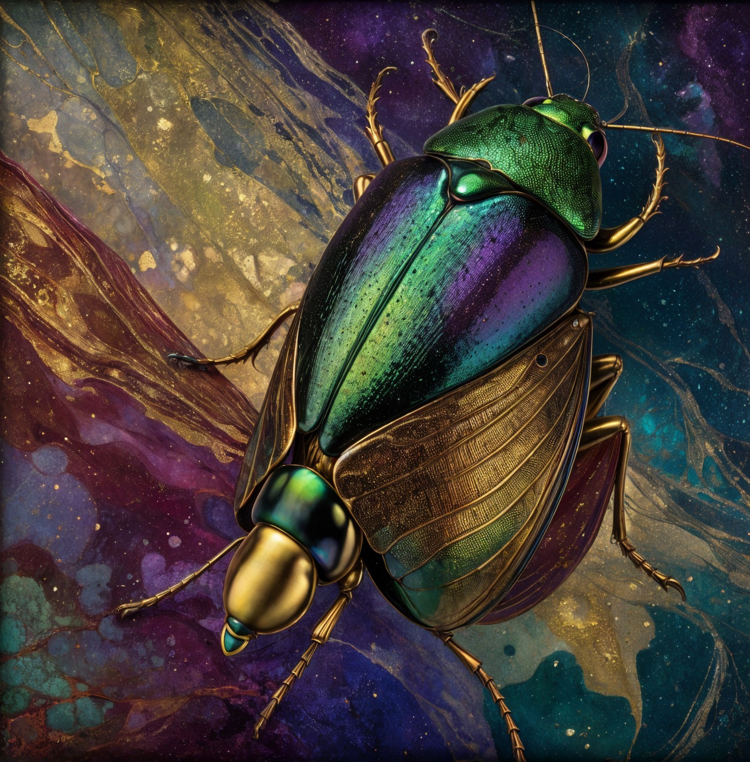 The image depicts a vibrant, iridescent beetle with shimmering green, blue, and red hues, resting on a colorful marbled background featuring gold accents. Its intricate details are striking.