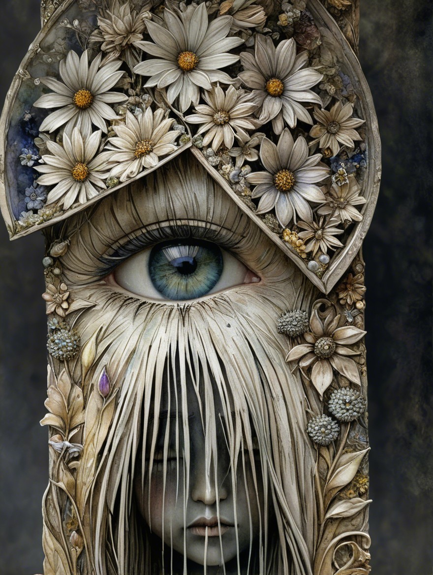 A surreal depiction of an eye surrounded by vibrant flowers and butterflies, blending nature and humanity. The intricate details create a mesmerizing connection to the natural world.