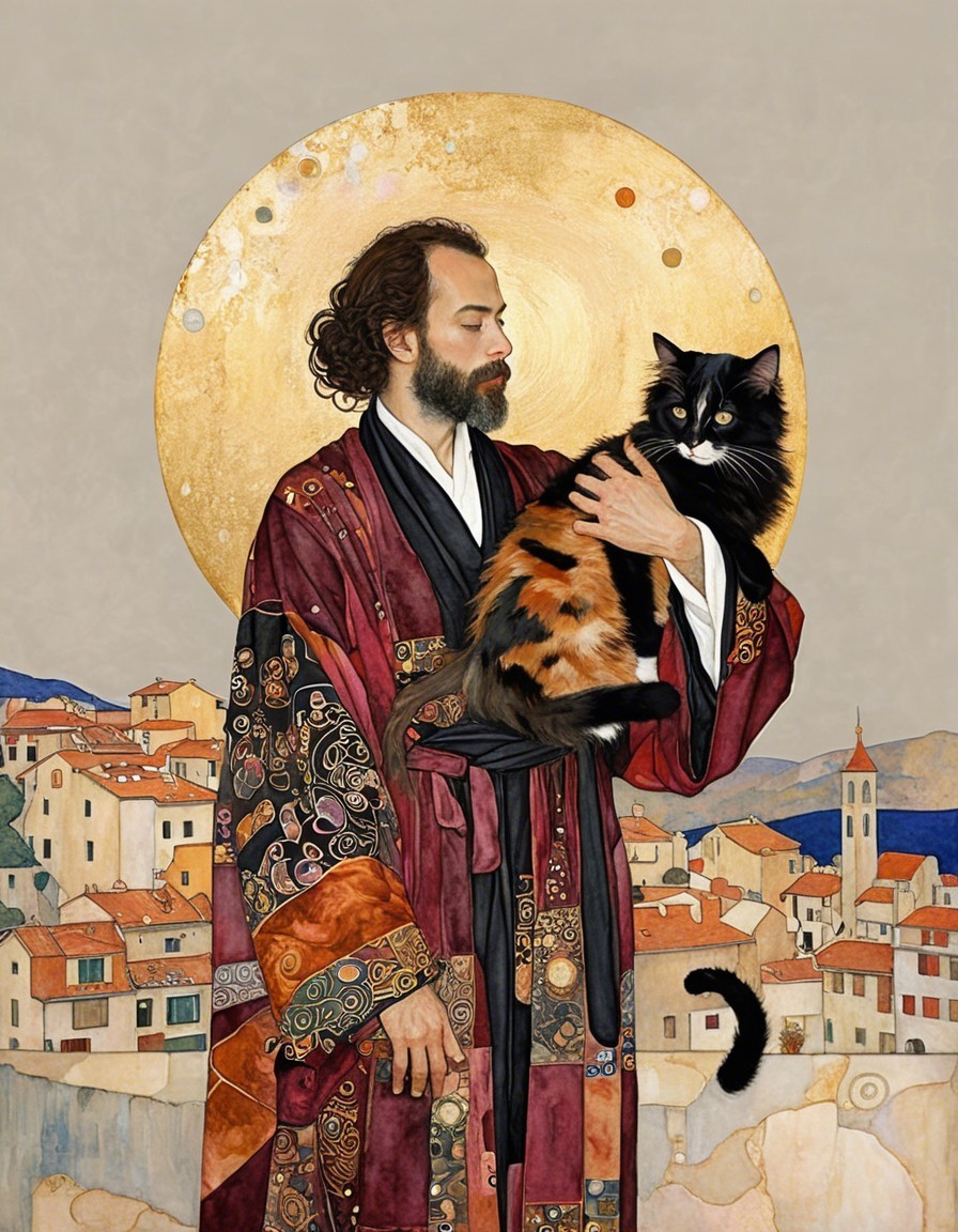 Prompt: Artist Gustav Klimt in his long painting robe, holding his long hair calico cat, whimsical, beautiful, poignant, touching. colors rose, gold, rust, burgundy, black.