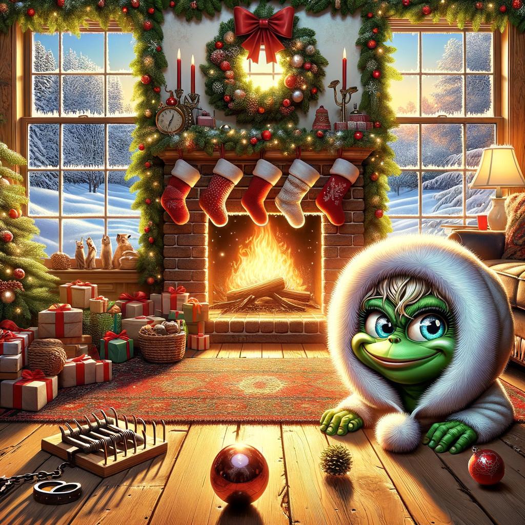 A cozy Christmas living room features a crackling fireplace, stockings, and a whimsical, grumpy creature peeking through a frosted window. A cheerful girl holds a festive sign, enhancing the holiday spirit.