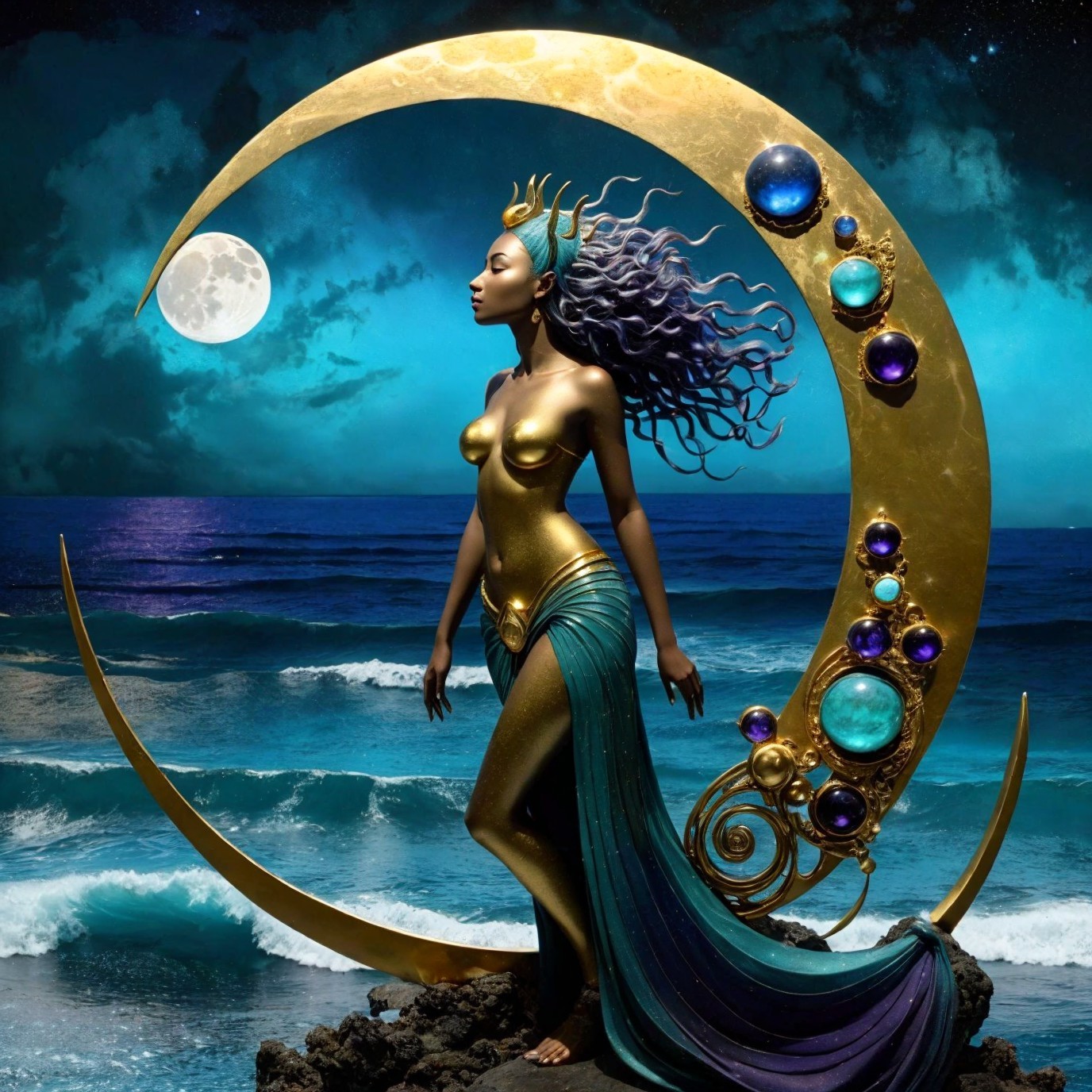 A mythical figure with sea-inspired attire sits on a crescent adorned with celestial orbs, against a night ocean backdrop.