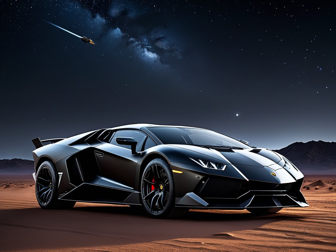 A sleek, futuristic Lamborghini sports car stands on a desert landscape under a vivid, cosmic sky filled with stars and a comet, blending luxury and sci-fi elements in stunning colors.