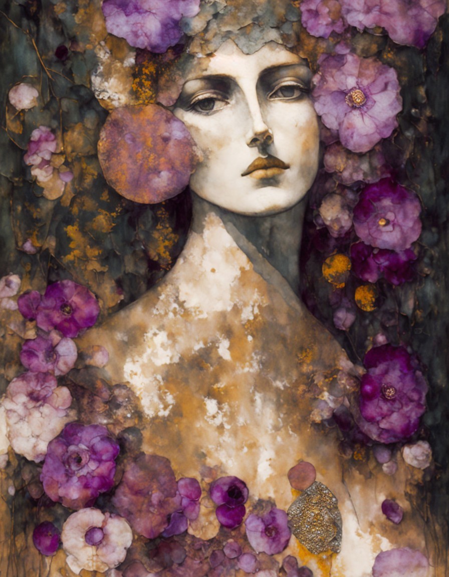 Beautiful woman, portrait in ochre, patina of ancient stone with moss, art brut, moody, somber, desaturated colors, in the style of Paul Klee, Arthur Rackham