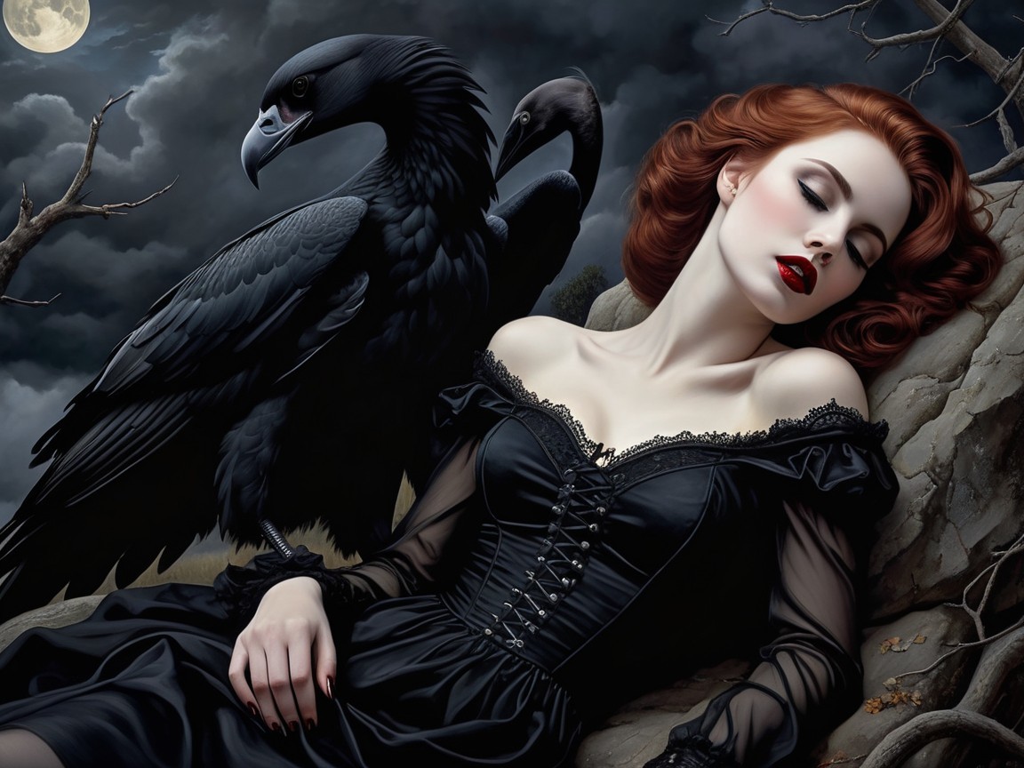 A striking woman with red hair, dressed in a black gown, reclines against a dark background. A majestic raven perches beside her, creating a hauntingly elegant atmosphere under a full moon.