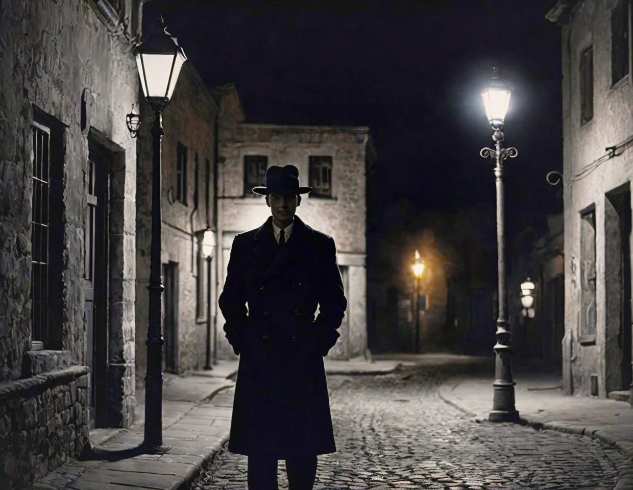 A man in a fedora and trench coat stands on a dimly lit, cobbled street at night. Postwar.