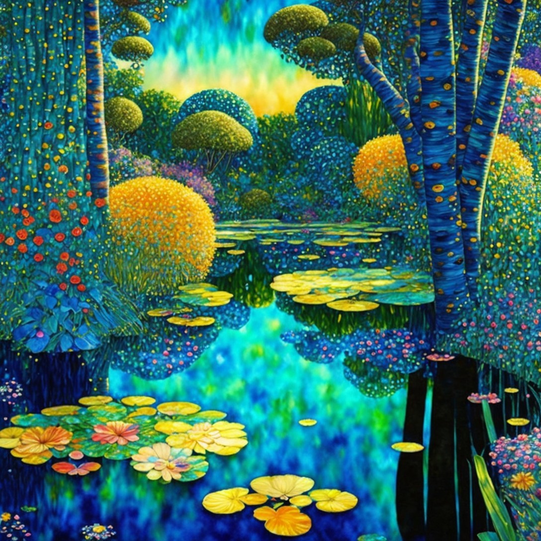 Prompt: "Wide view, 3D watercolor patchwork, in the very best style of Gustav Klimt of a pond reflecting a beautiful Tingatinga style garden with numerous tropical flowers with vibrant spectacular colors, luxurious trees, plants with delicate leaves in shades of azure blue and teal and gold, golden sunrise rays shimmering over the scene, detailed intricate, satiny, high quality, elegant, highly detailed, glistening magic style with elements in the style of Jan Toorop"