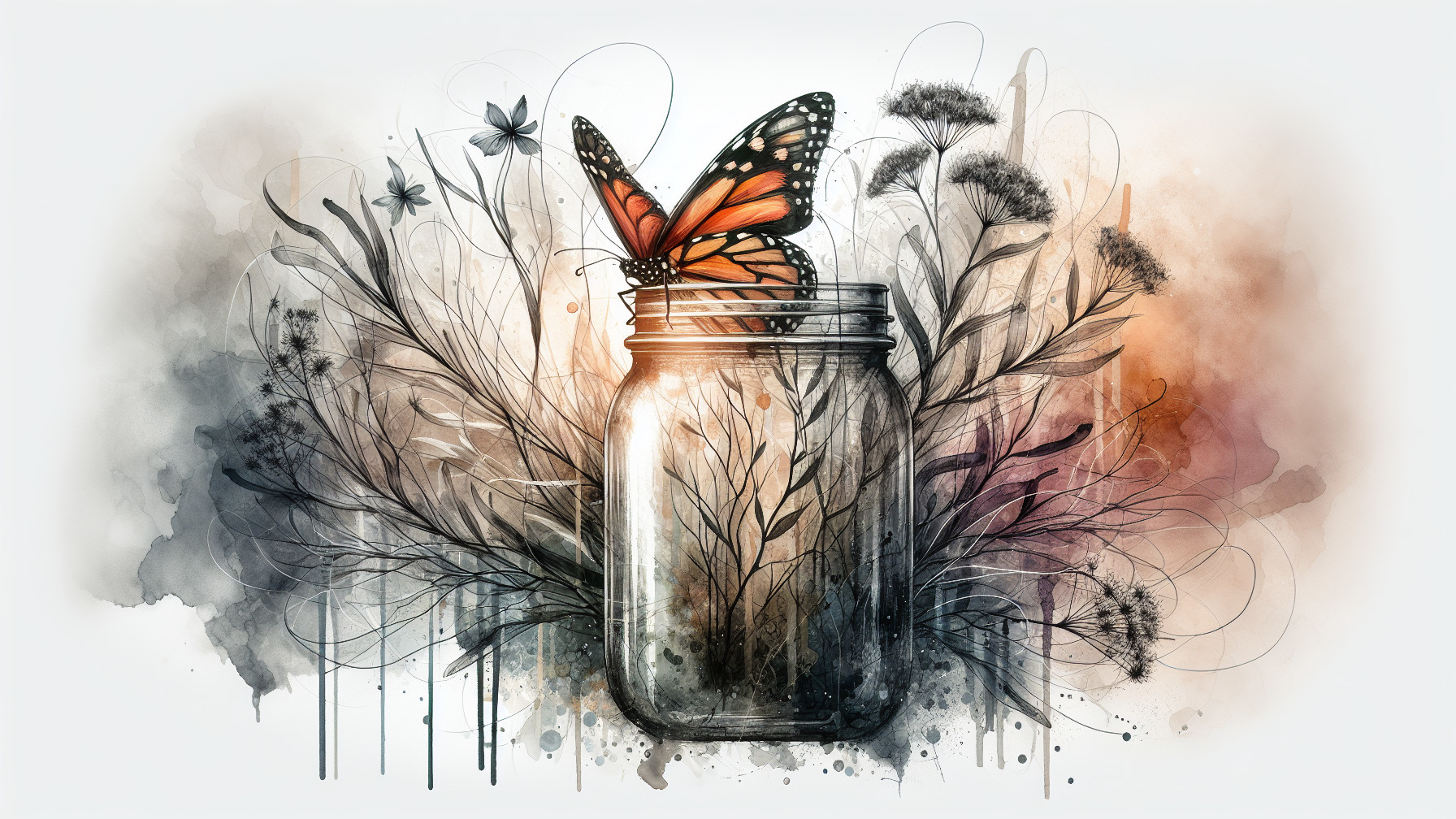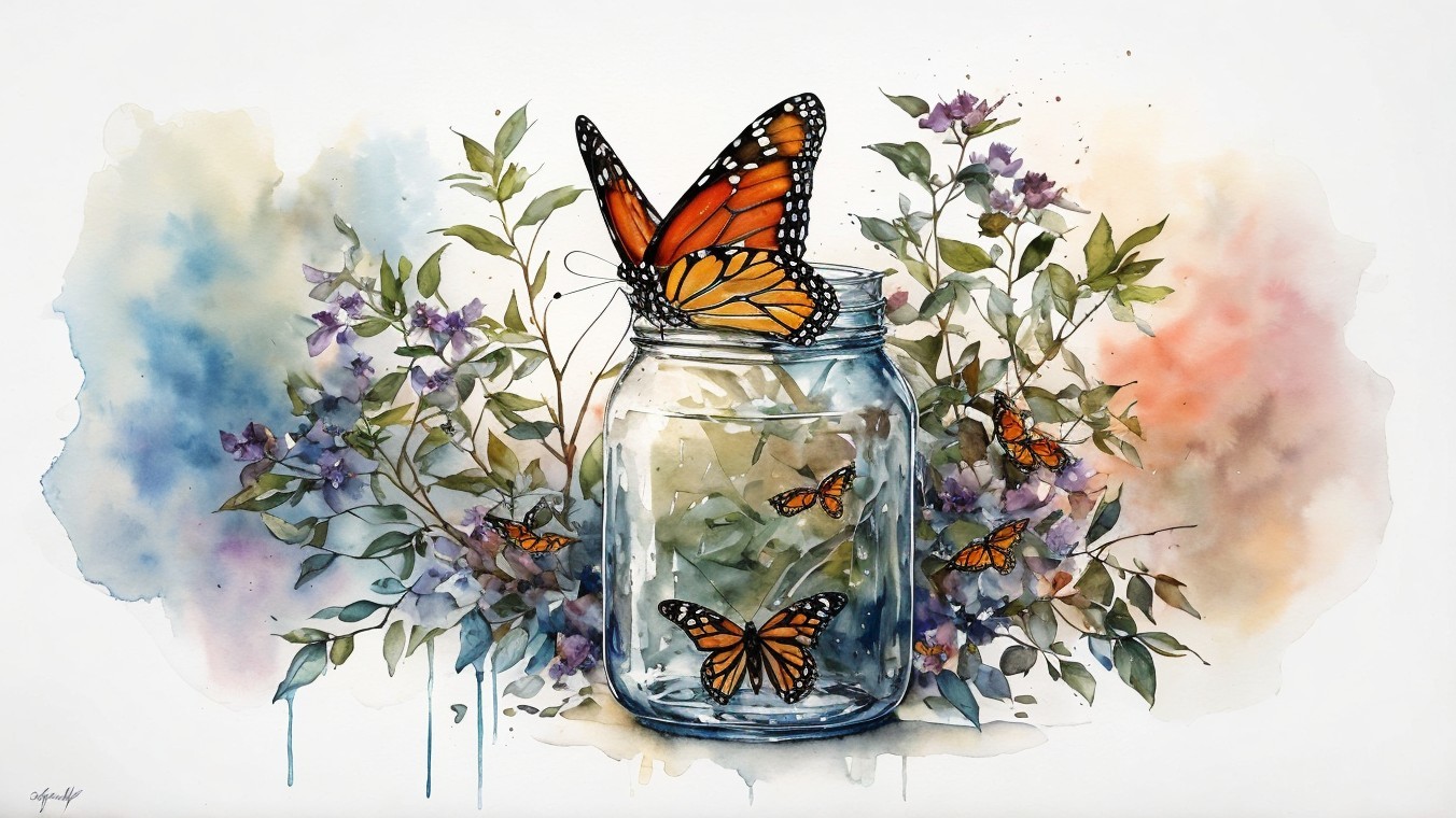 A vibrant watercolor illustration features a glass jar with blooming flowers inside, surrounded by delicate branches. A striking monarch butterfly flutters nearby against a soft, colorful background.