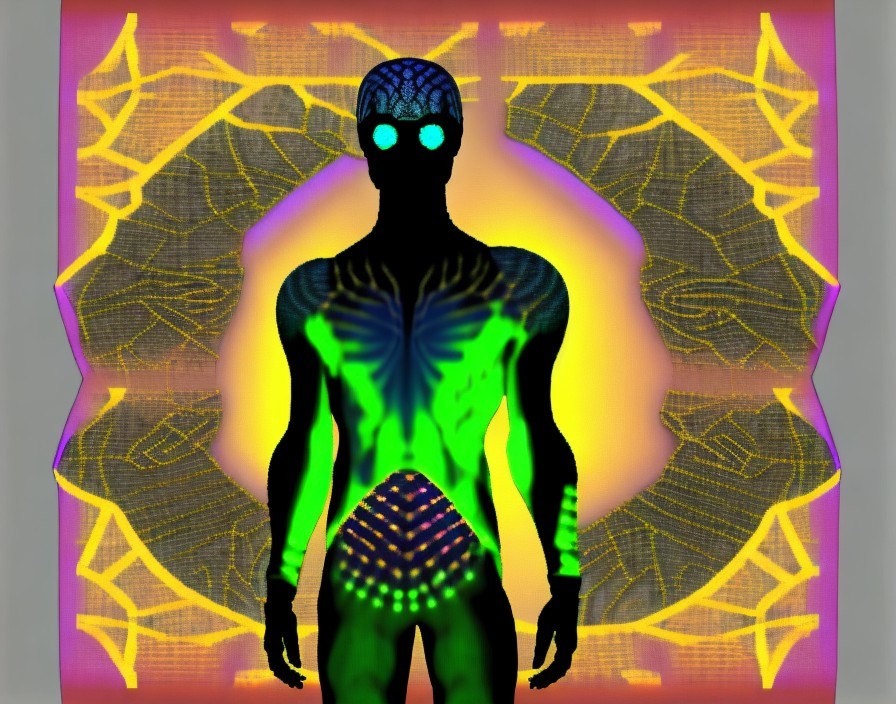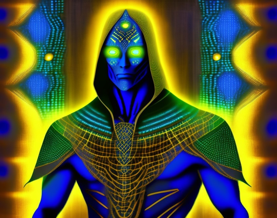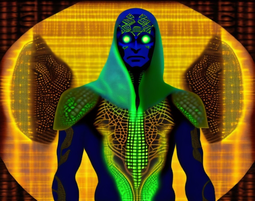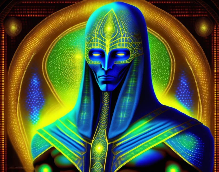 Ancient script-covered fabric layers, intricate hieroglyphs, piercing grey eyes, concealed lower face, shadowed and weathered hood, aged appearance, frayed threads, rough textured fabric, cobweb details, abandoned ambiance, armor straps, rich color palette of deep blues, dark greens, earthy browns, gold accents, silver hints, vertical composition, mysterious gaze, detailed illustration with an elegant and ornate touch, hypermaximalist female figure, orange and yellow tones, insanely intricate and hyper-realistic linoleum print with 3D woodcut art elements. The artwork embodies a perfect dystopian style reminiscent of Vassily Kandinsky, Gustav Klimt, Jacek Yerka, and Jeremy Mann. The image is of high quality, in 4K resolution, created by the talented artist Gobi, available on Artstation.Splash,female, orange and yellow tones, insanely detailed and intricate, hypermaximalist, elegant, ornate, hyper realistic, super detailed,linoleum print,3D Wood cut art ,illustration described in the perfect dystopian art style of Vassily Kandinsky, Gustav Klimt, Jacek Yerka and Jeremy Mann, HQ, 4K, bygobiArt by, Rosina Wachtmeister, Emilia Dziubak, Marc Chagall, Toulouse-lautrec, Van Gogh neo-impressionism expressionist style oil painting, smooth post-impressionist impasto acrylic painting, thick layers of colourful textured paint, incorporating cybernetic and ancient Egyptian elements. The subject's head should be adorned with an elaborate headdress resembling structures akin to ancient Egyptian architecture with intricate patterning and details. Her face is artfully integrated with futuristic cybernetic enhancements which include metallic plating and circuitry seamlessly blending with her skin, emphasizing her left cheek, forehead, and chin. The eyes should be piercing, highlighted by delicately applied makeup reminiscent of traditional Egyptian styles. Include sizable, detailed earrings made of mixed metallic elements, contributing to the regal and technological fusion, sacred