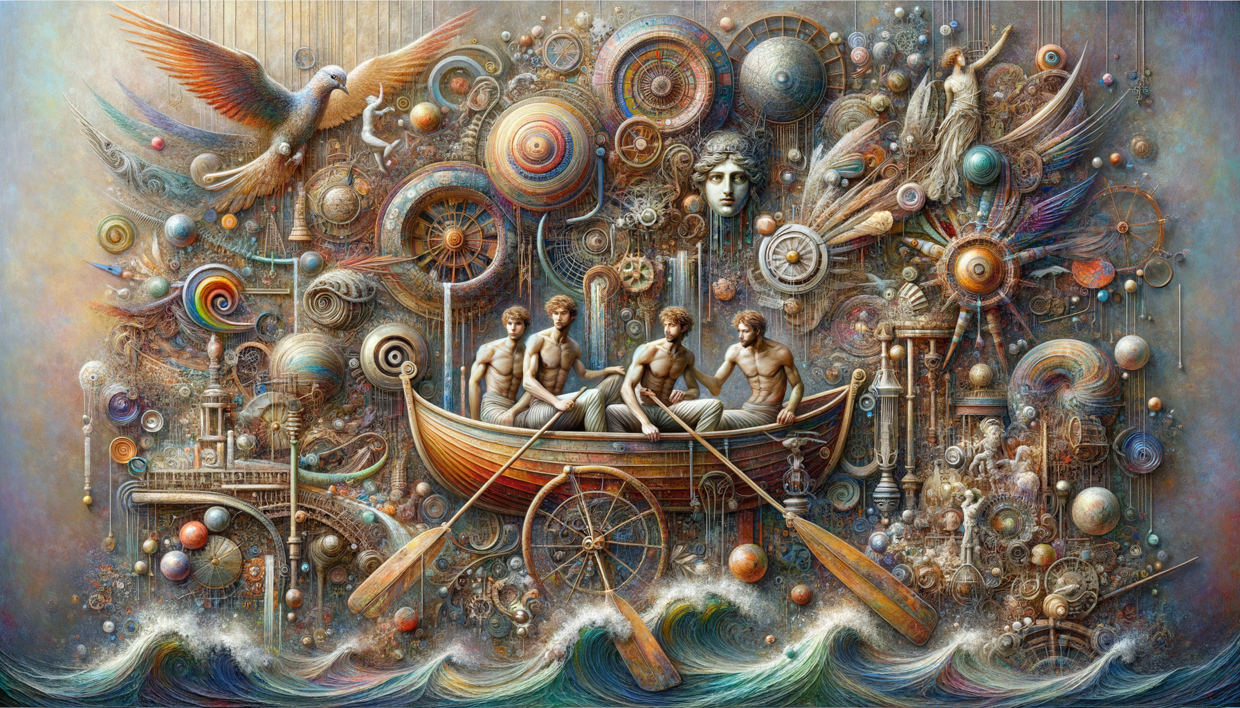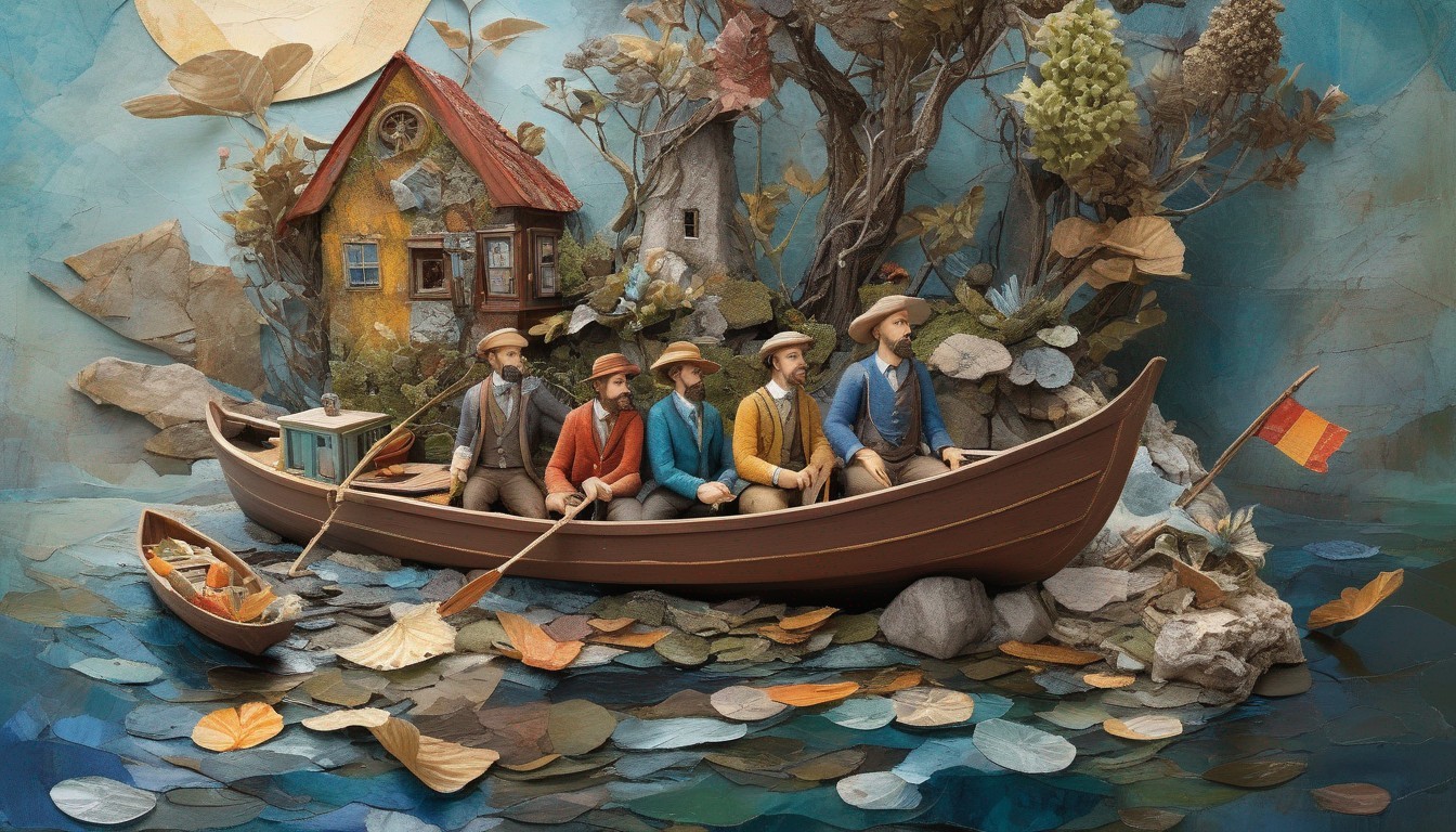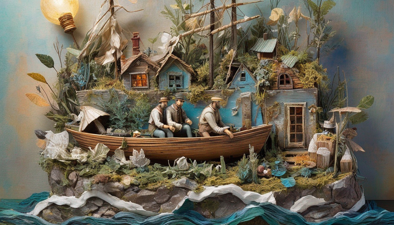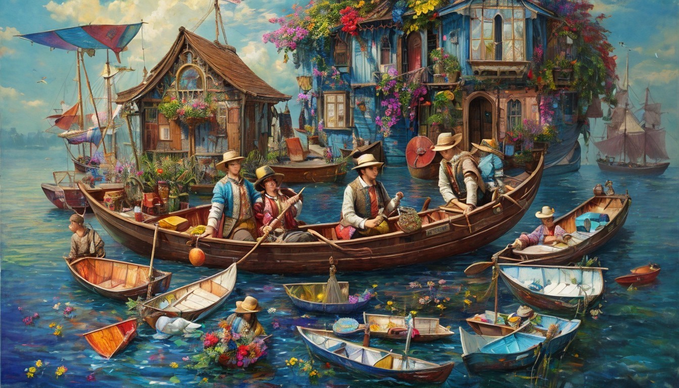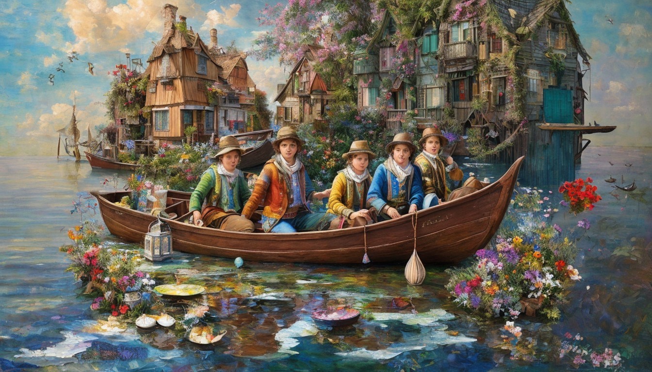 Three men in a boat in a whimsical water village with floating houses and items, depicted in a colorful, geometric art style.