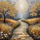 The image depicts a vibrant autumn landscape with two trees, a shimmering river, and colorful flowers. The sun radiates above, casting warm light over the scenic, mosaic-like scene.
