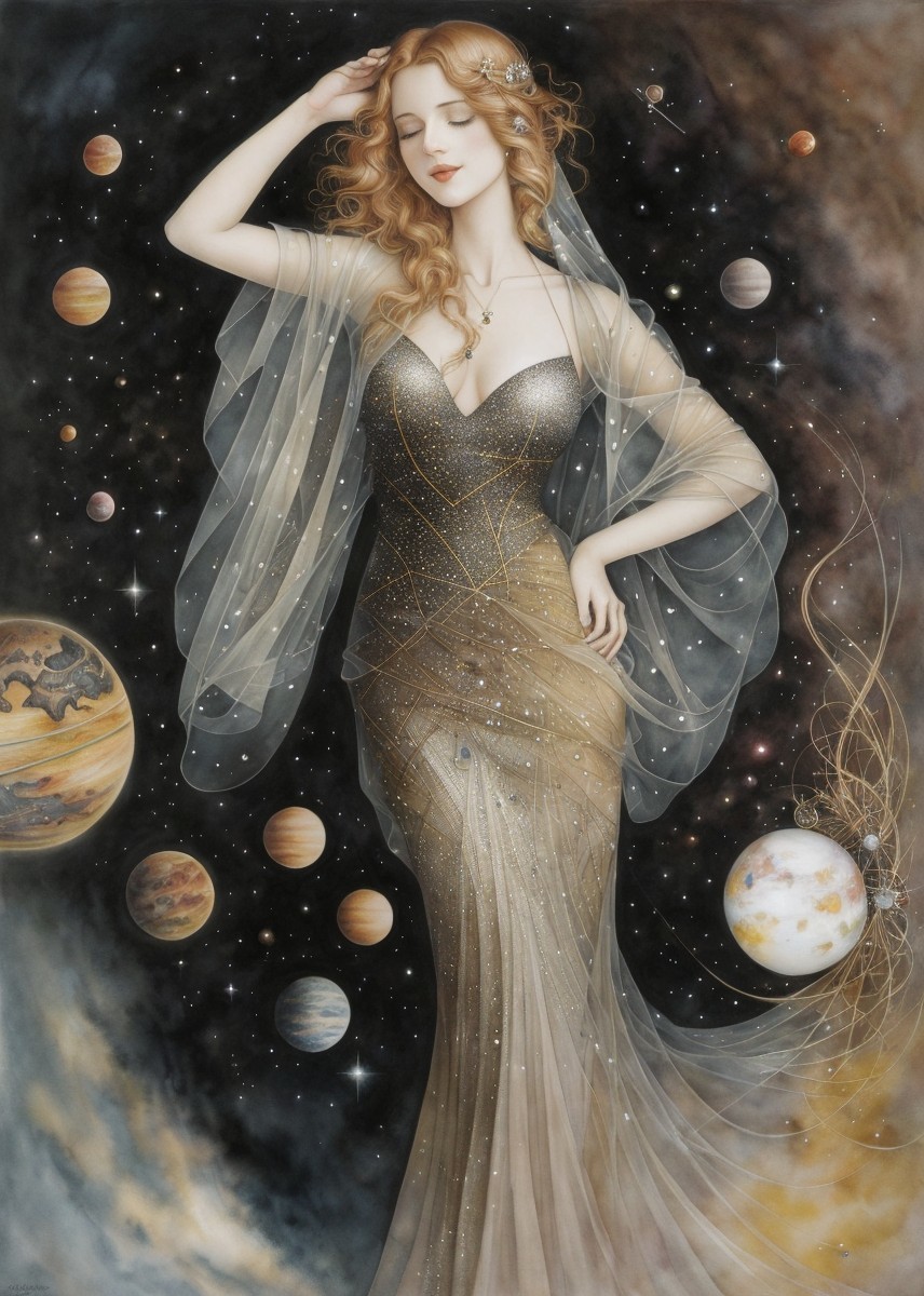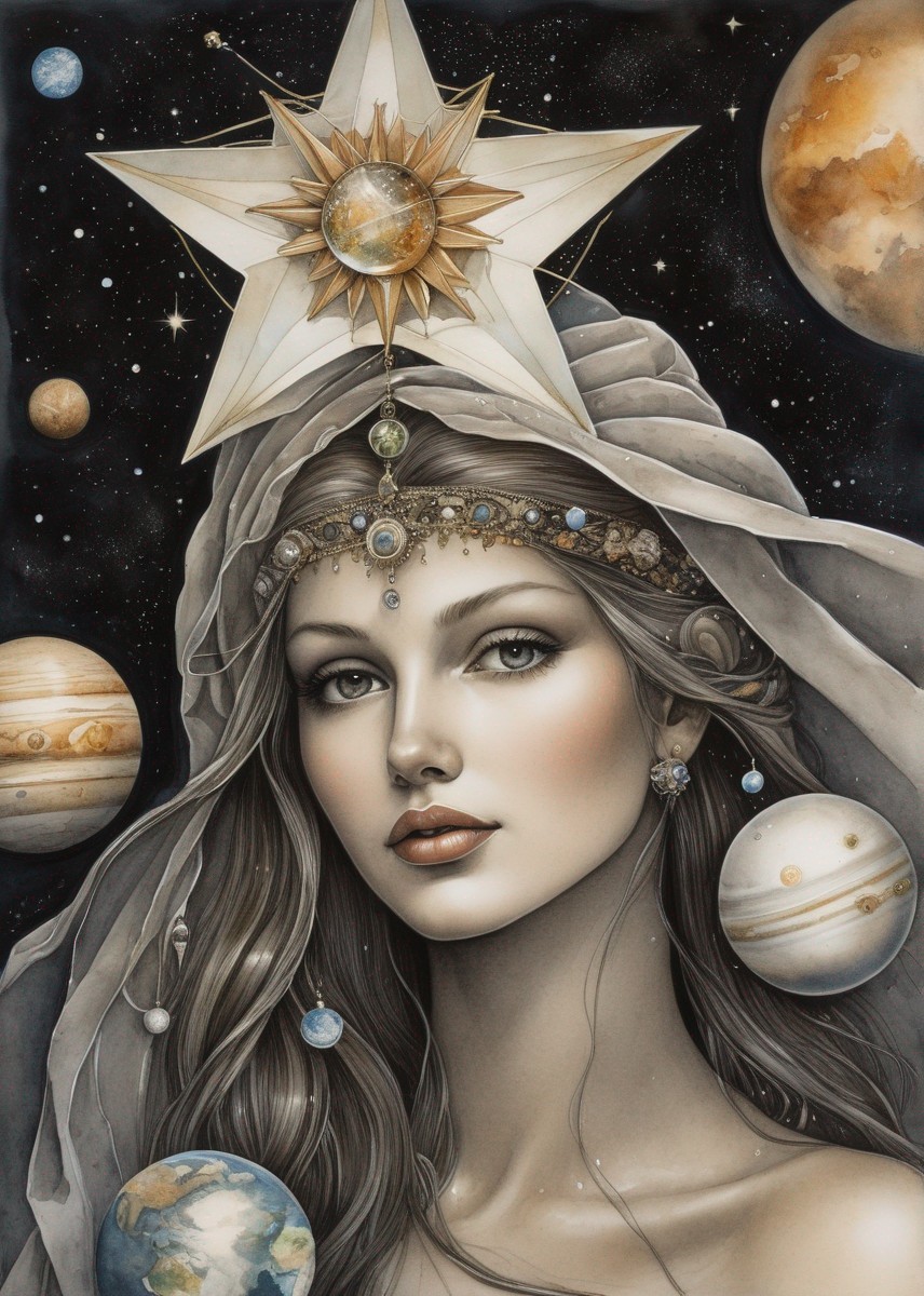 A portrait of a fantasy female with a starry crown, celestial jewelry, and planets in the background, exuding a mystical aura.