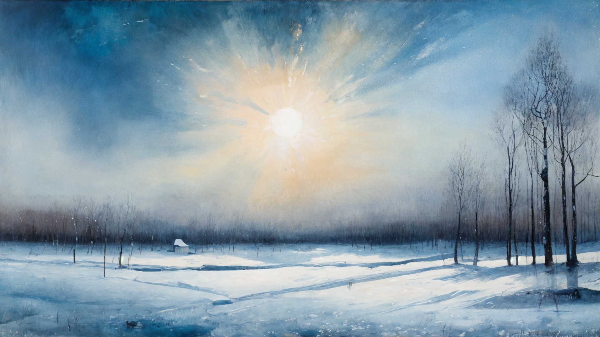 Grateful thanks to original dreamer and try-it button. A very moving picture. Serene winter landscape features a bright sun shining over a snowy expanse, with soft blue skies and wispy clouds. Bare trees add a touch of contrast to the tranquil scene.