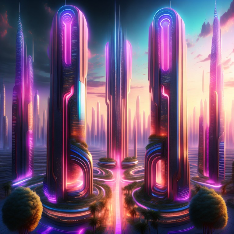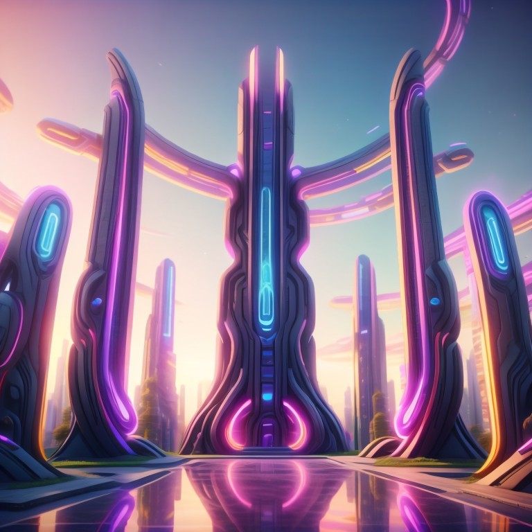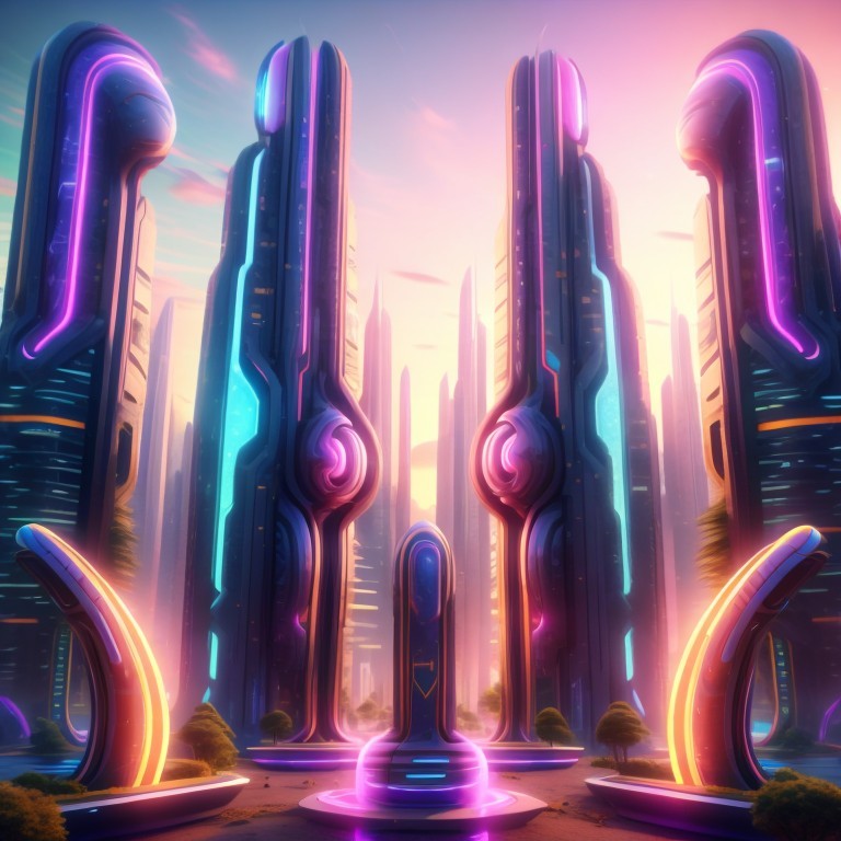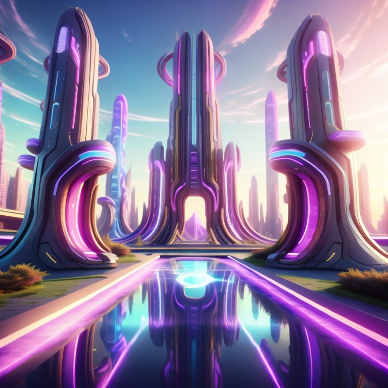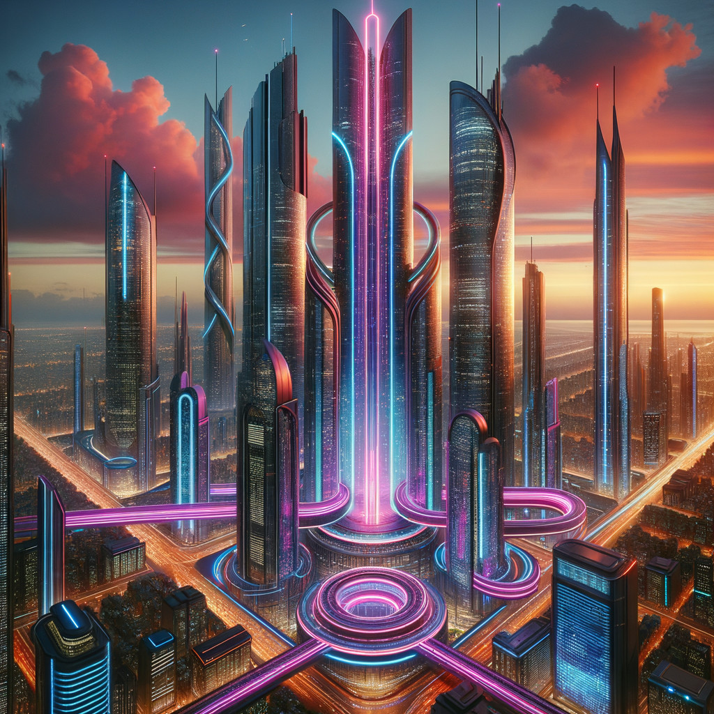 A futuristic cityscape with sleek, curved skyscrapers by a river, under a pastel twilight sky.
