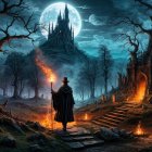 A mysterious figure in a dark cloak holds a torch, standing before a haunted castle. Twisted trees frame the path leading to the entrance, while gravestones and a distant bonfire add to the eerie atmosphere.