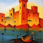 A vibrant, surreal landscape features a bold, red castle against a golden sky. Strange, whimsical boats float in reflective waters, with abstract figures and shapes enhancing the dreamlike scenery.
