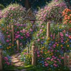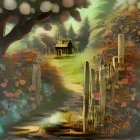 A serene landscape features charming cottages nestled among vibrant flowers, set against rolling hills and a majestic tree, all illuminated by a soft, pastel sunset.