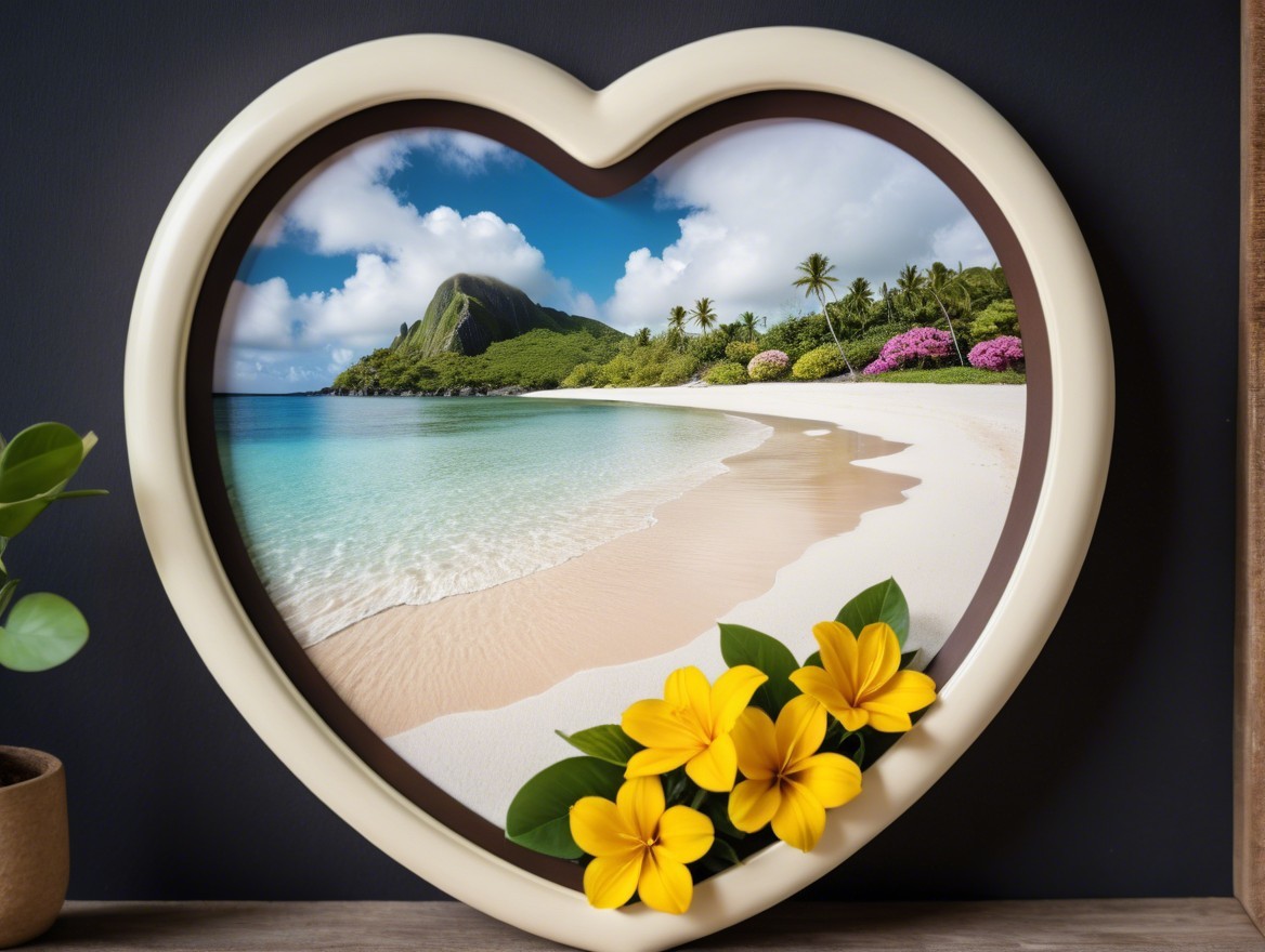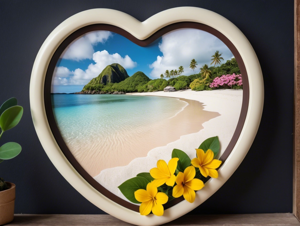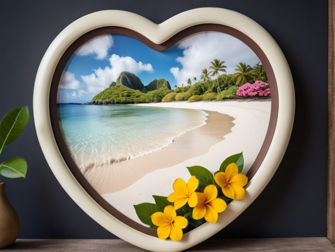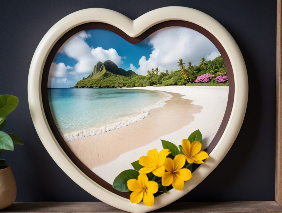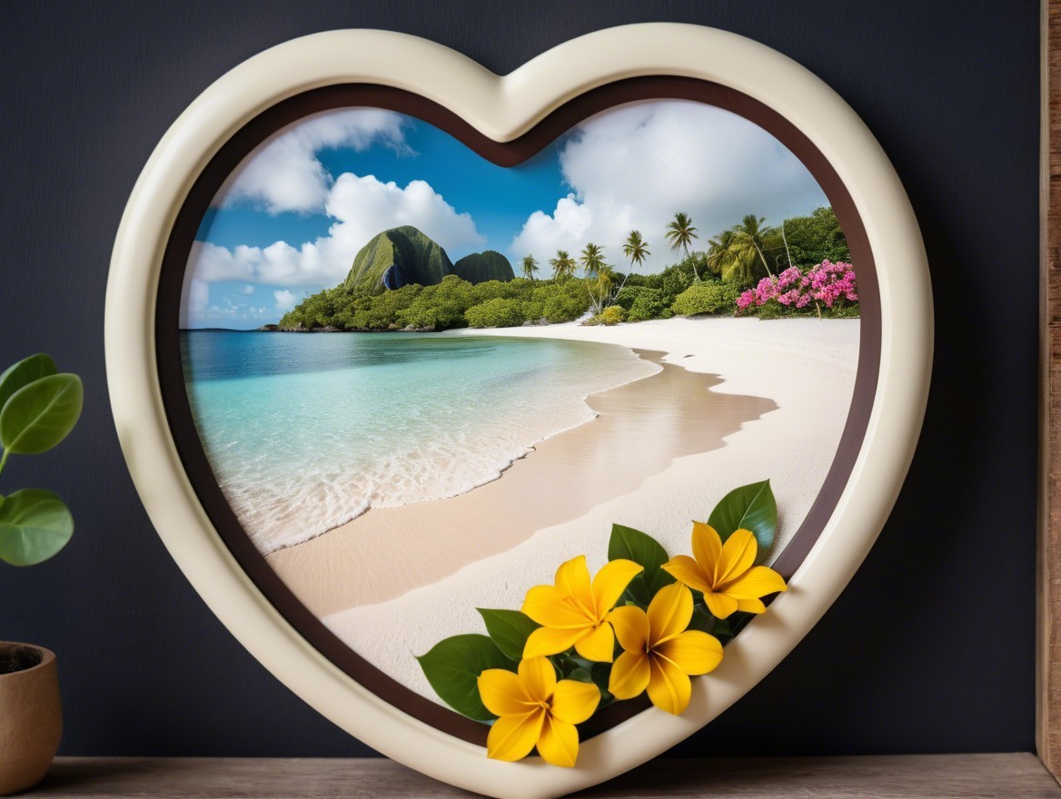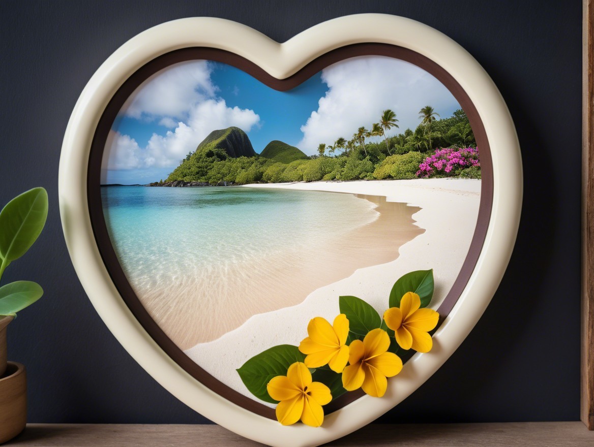 A heart-shaped frame displays a serene beach scene with lush green hills, tropical palm trees, and a clear blue sky, adorned with vibrant yellow flowers for a sunny, tropical feel.