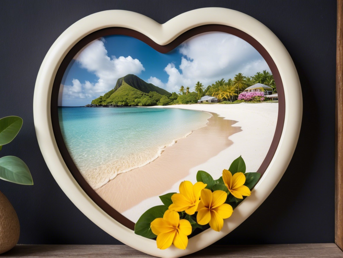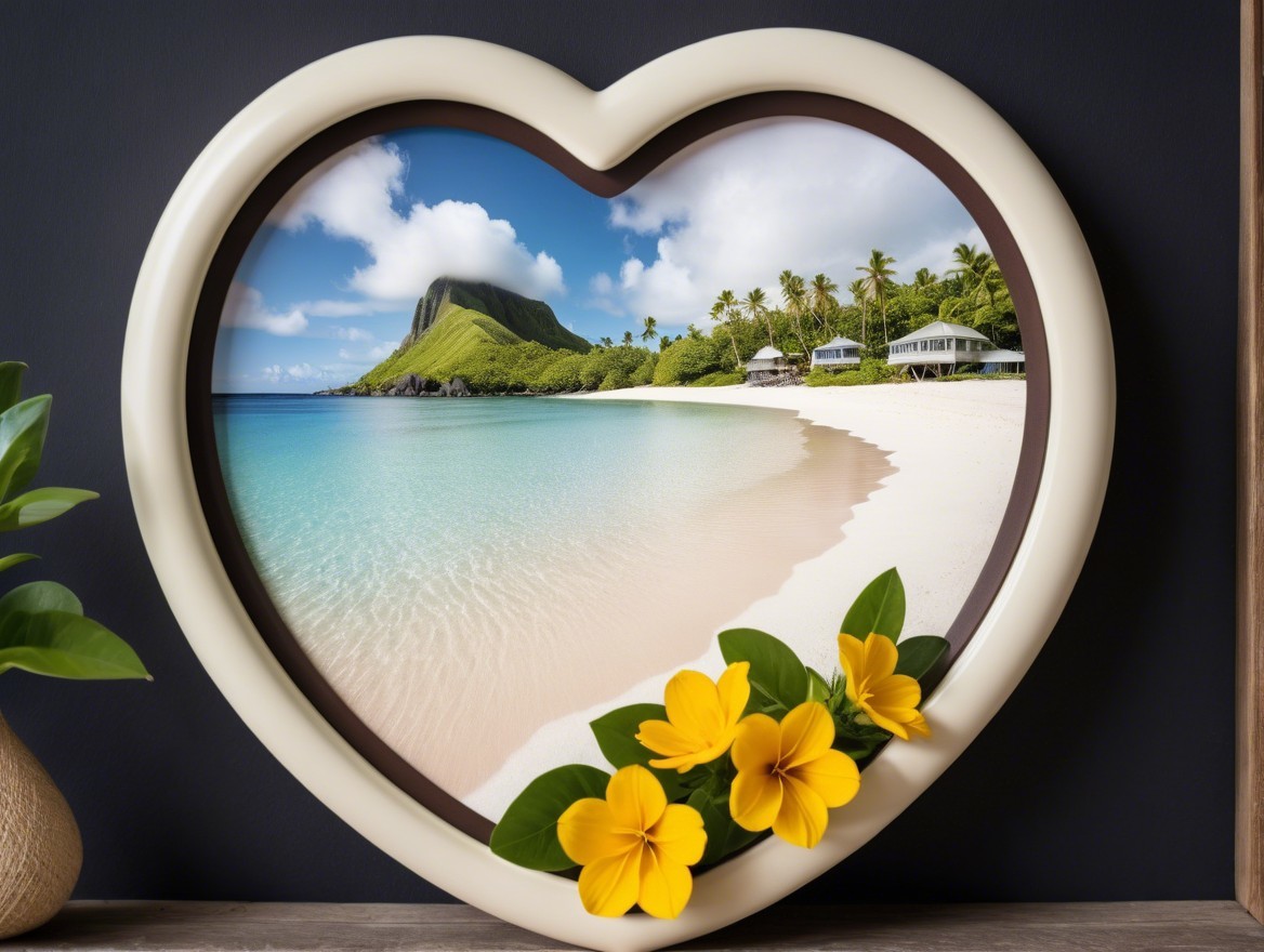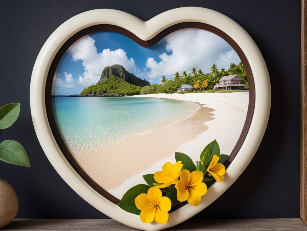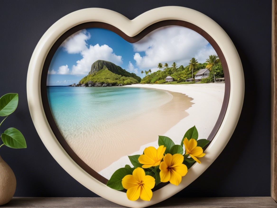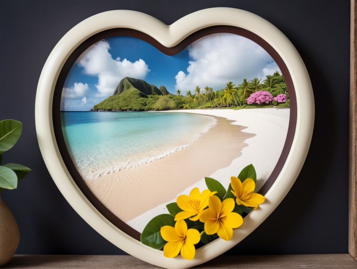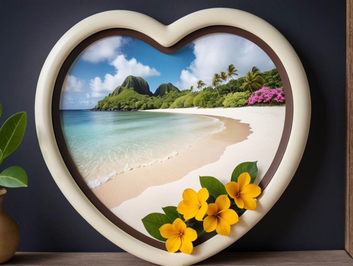 A heart-shaped frame displays a serene beach scene with lush green hills, tropical palm trees, and a clear blue sky, adorned with vibrant yellow flowers for a sunny, tropical feel.