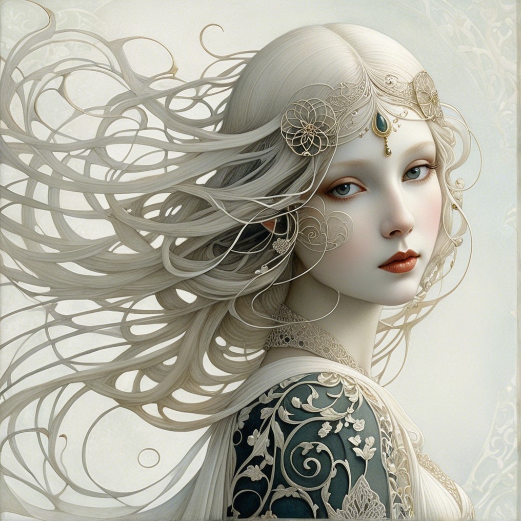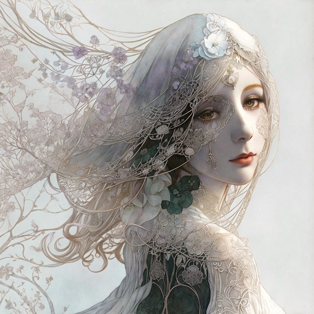 A serene, ethereal figure with flowing silver hair adorned with intricate floral designs. She wears an ornate green garment, accented with delicate golden patterns, against a soft, muted background.